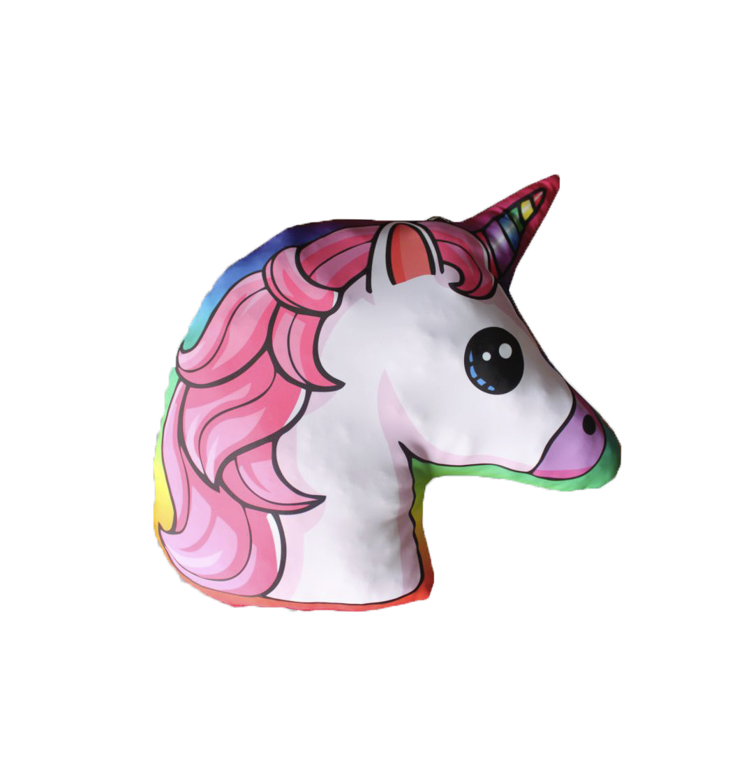 Almofada em forma de cabeça de unicórnio com crina rosa e chifre multicolorido