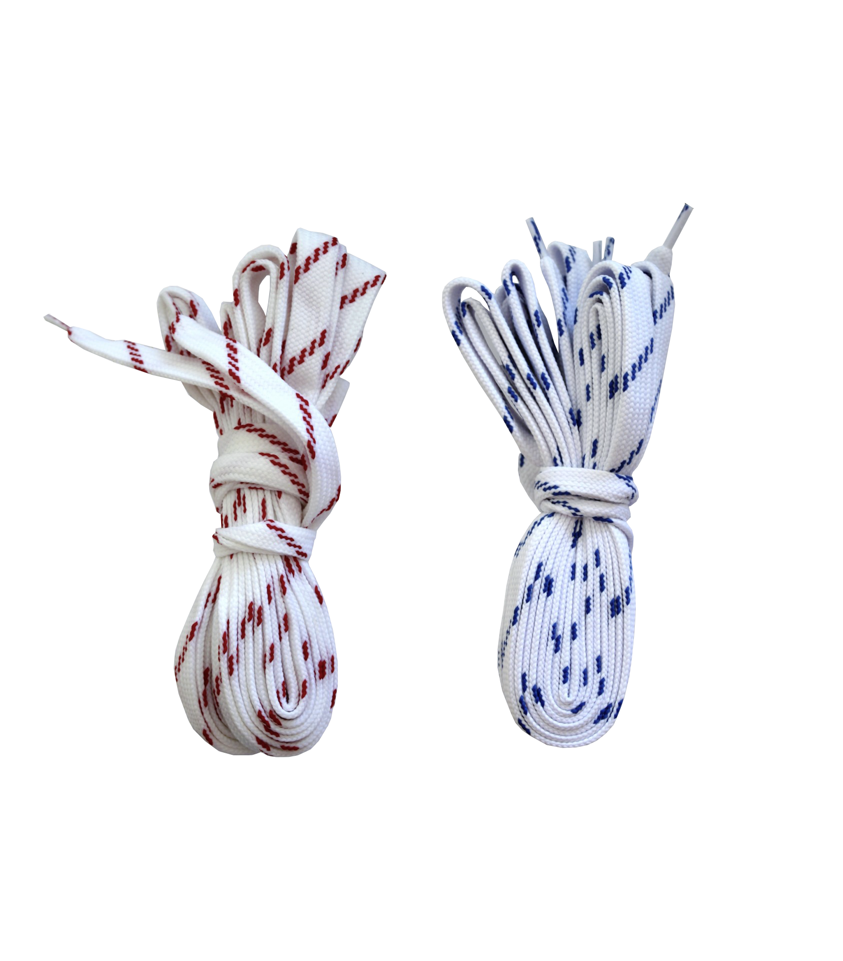 Dois pares de atacadores, um branco com linhas vermelhas e outro branco com linhas azuis, enrolados e amarrados