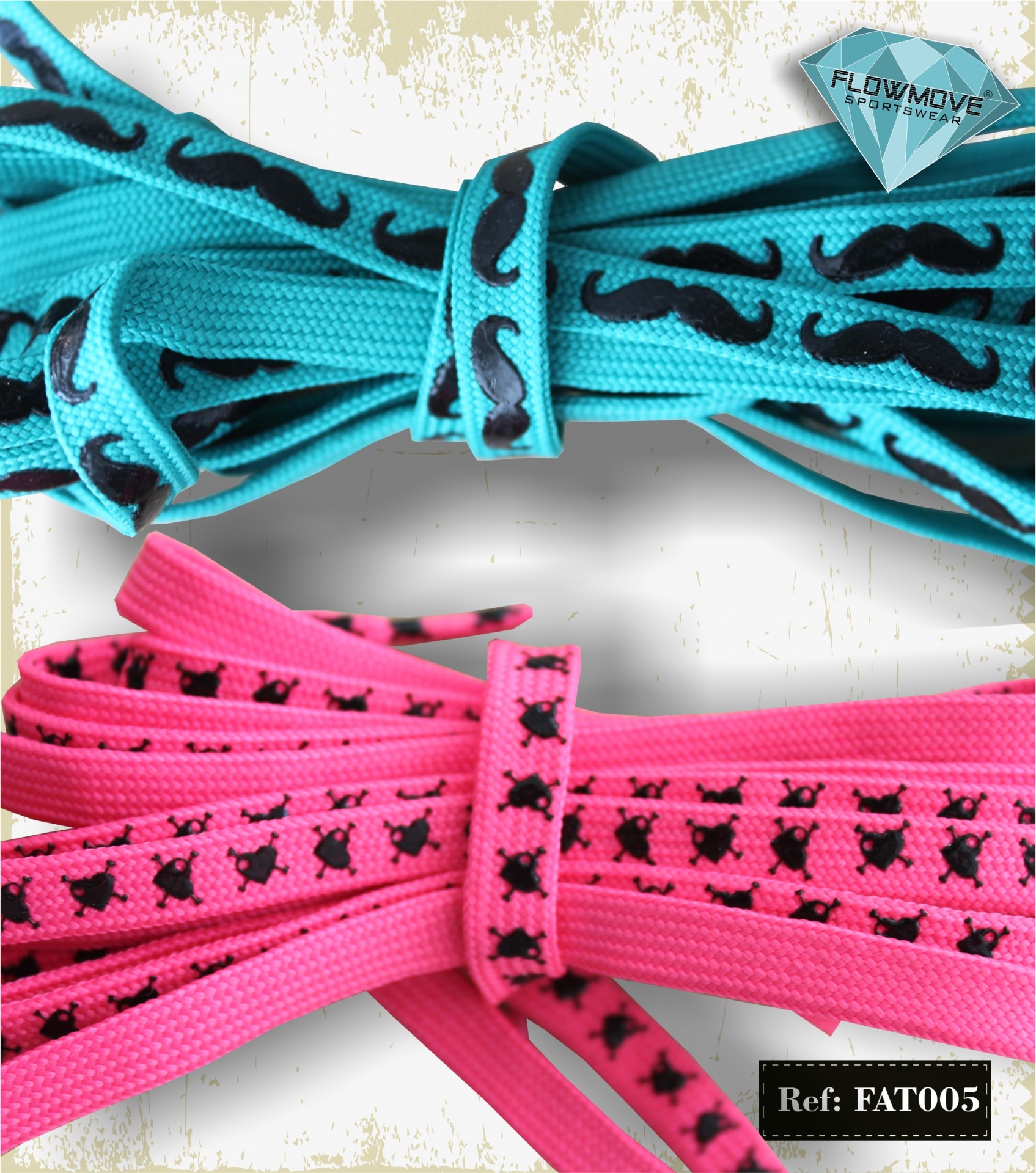 Cordas azuis e rosas com padrões pretos em bigodes e caveiras e etiquetas com texto