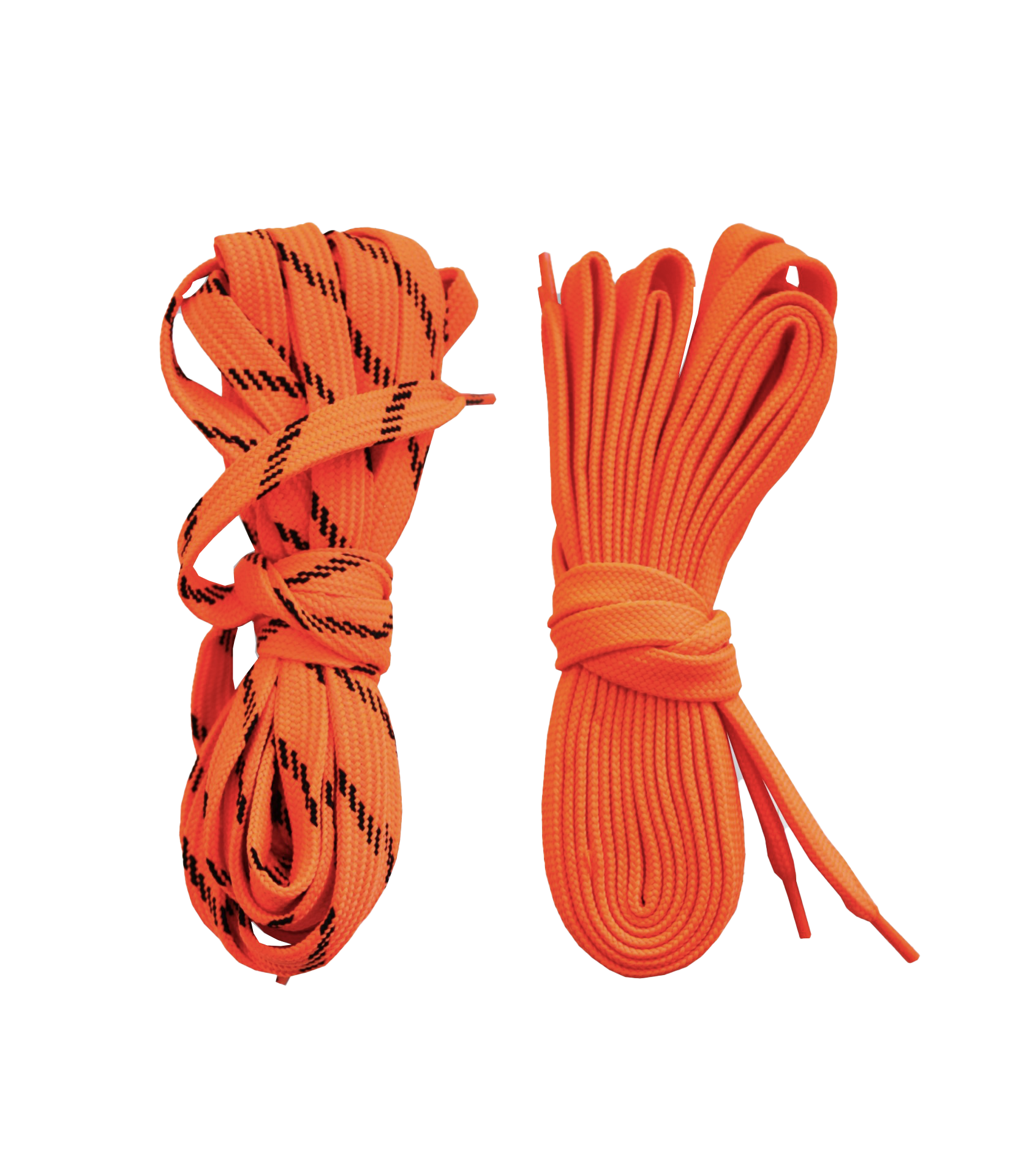 Dois pares de atacadores largos laranja, um com riscas pretas, outro liso, enrolados