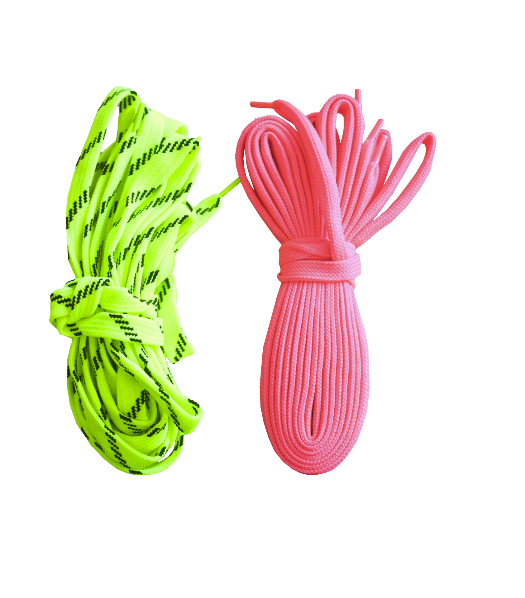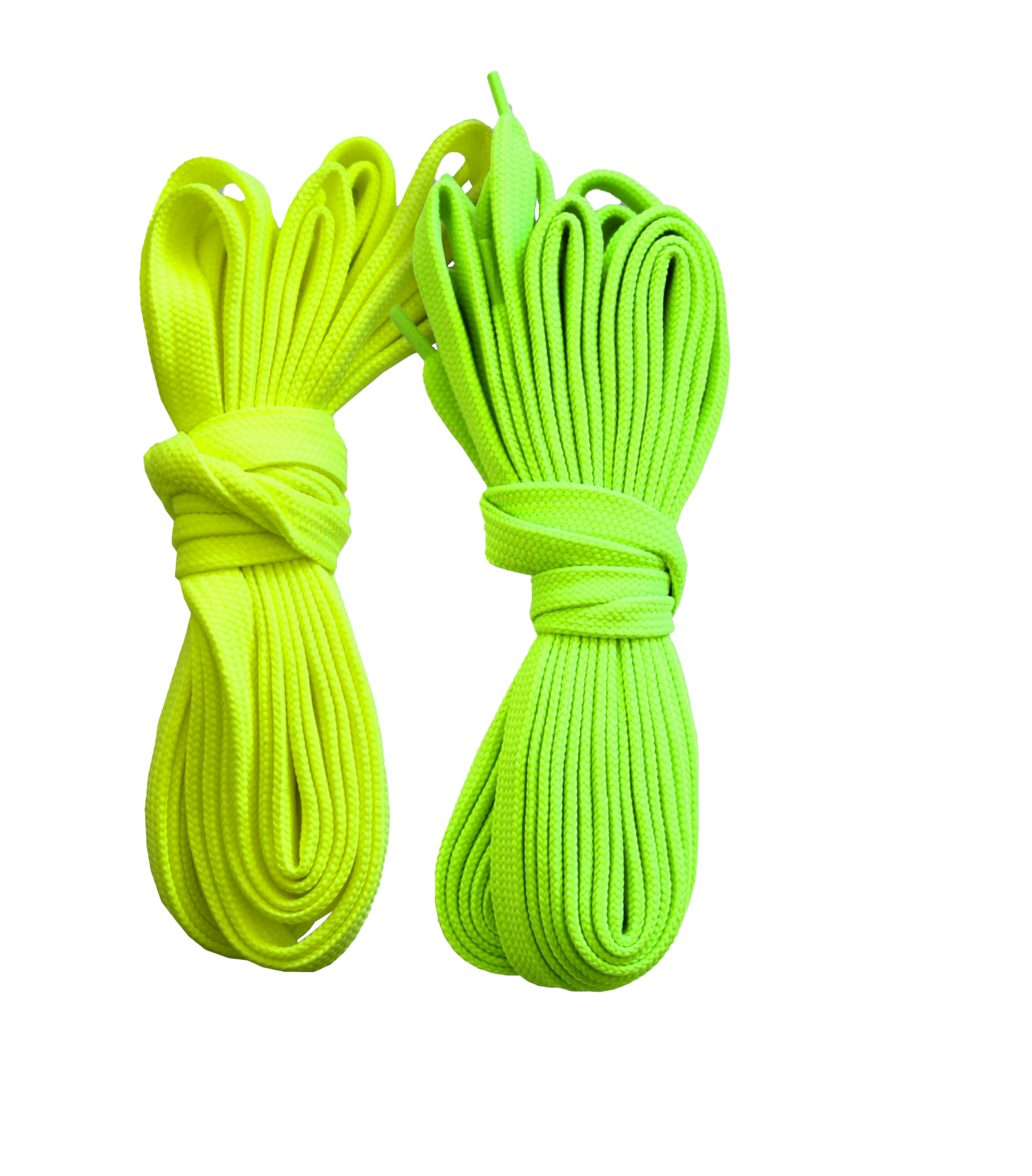 Dois pares de atacadores fluorescentes amarelo e verde enrolados