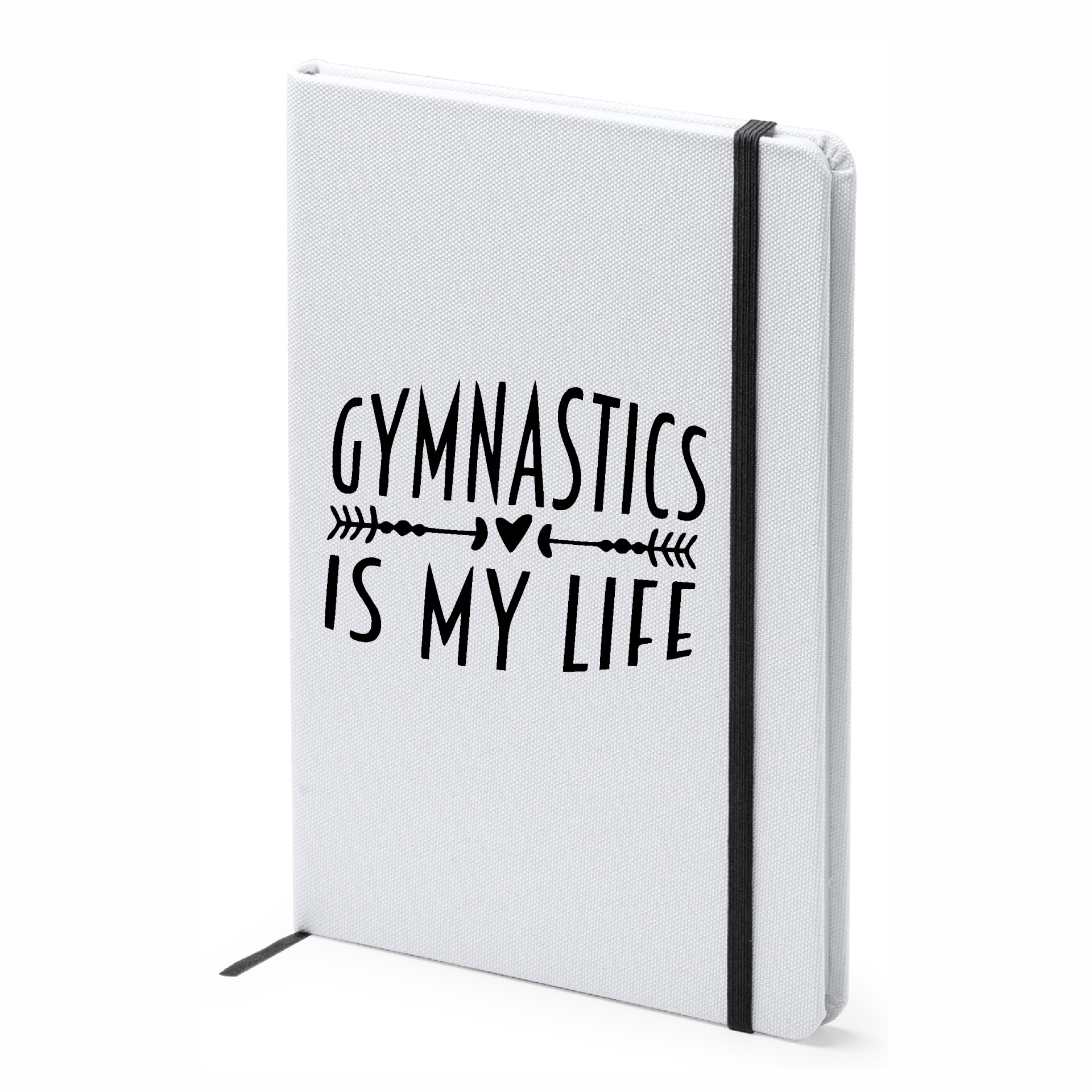 Caderno branco com texto 'GYMNASTICS IS MY LIFE'