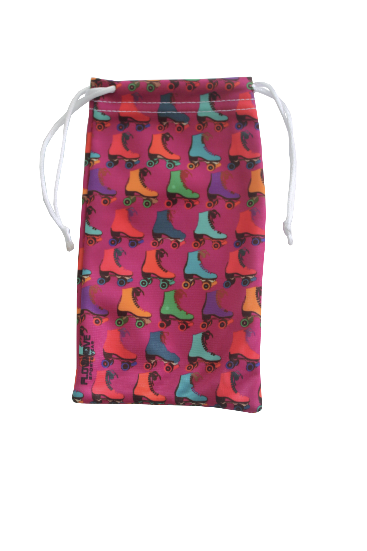 Saco de tecido rosa com padrão de patins coloridos e cordão branco