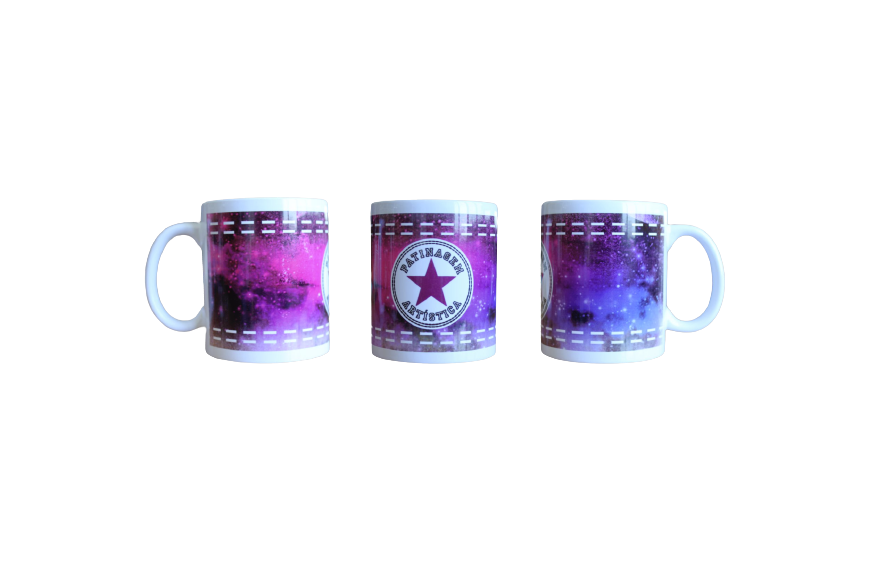 Três canecas coloridas com padrão estrelado e círculo com estrela e texto