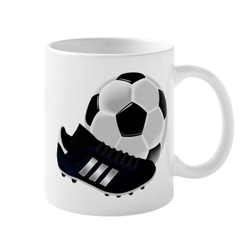 Caneca branca com bola de futebol e chuteira desenhadas