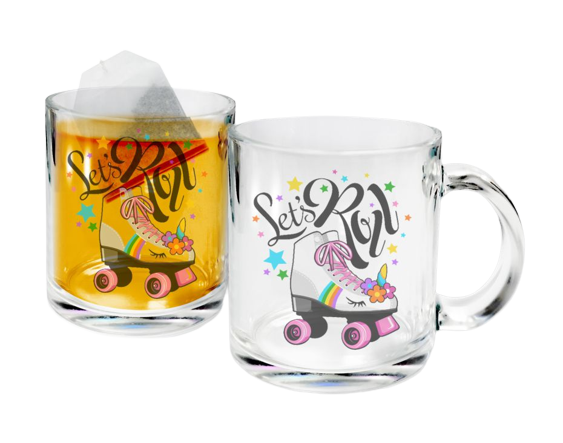 Duas canecas de vidro com ilustração de patim e texto Let's Roll