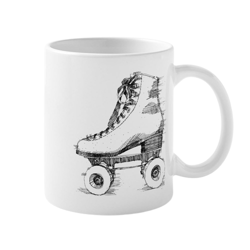 Caneca branca com desenho de patim clássico a preto e branco