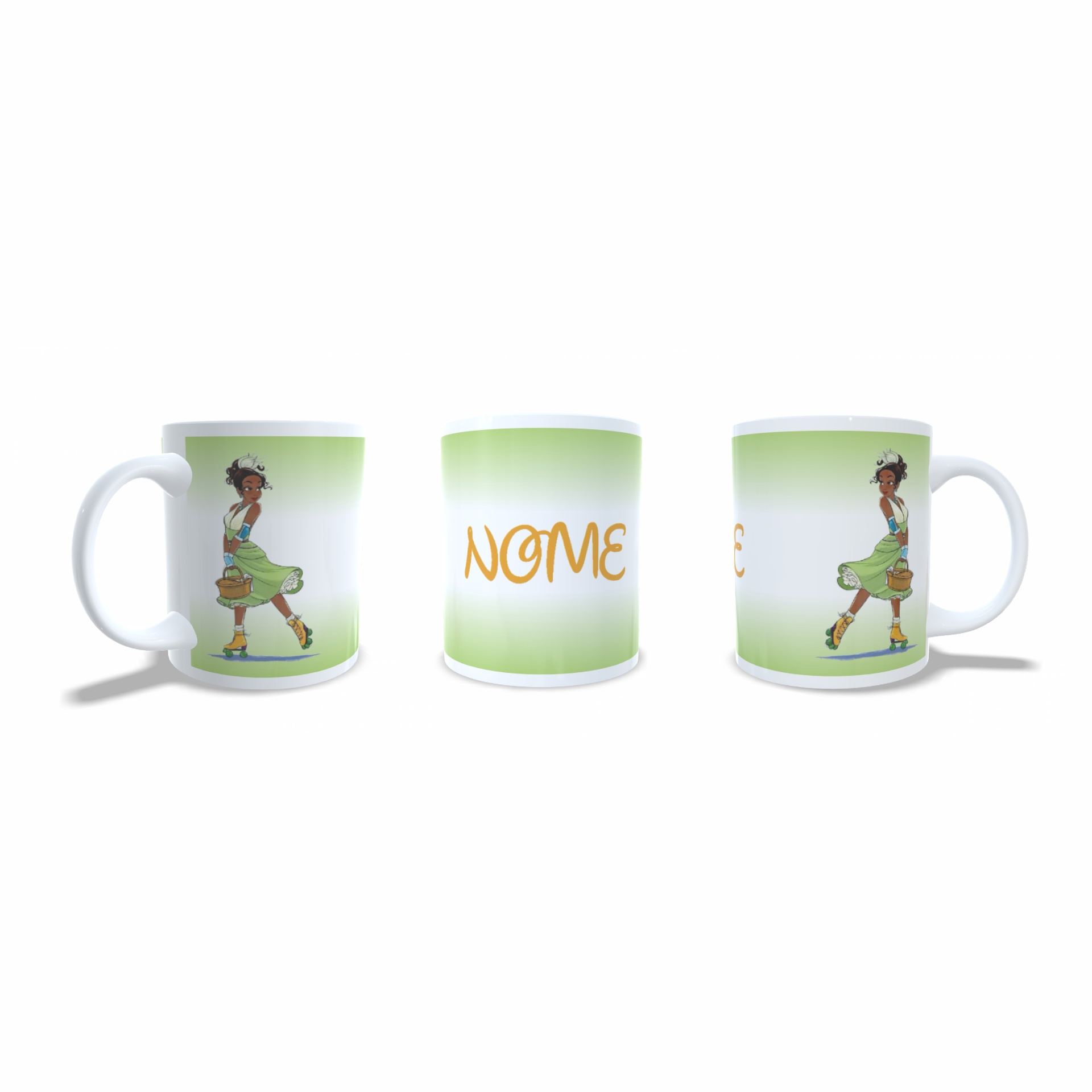 Caneca branca com ilustração de mulher e texto 'NOME' em verde e amarelo