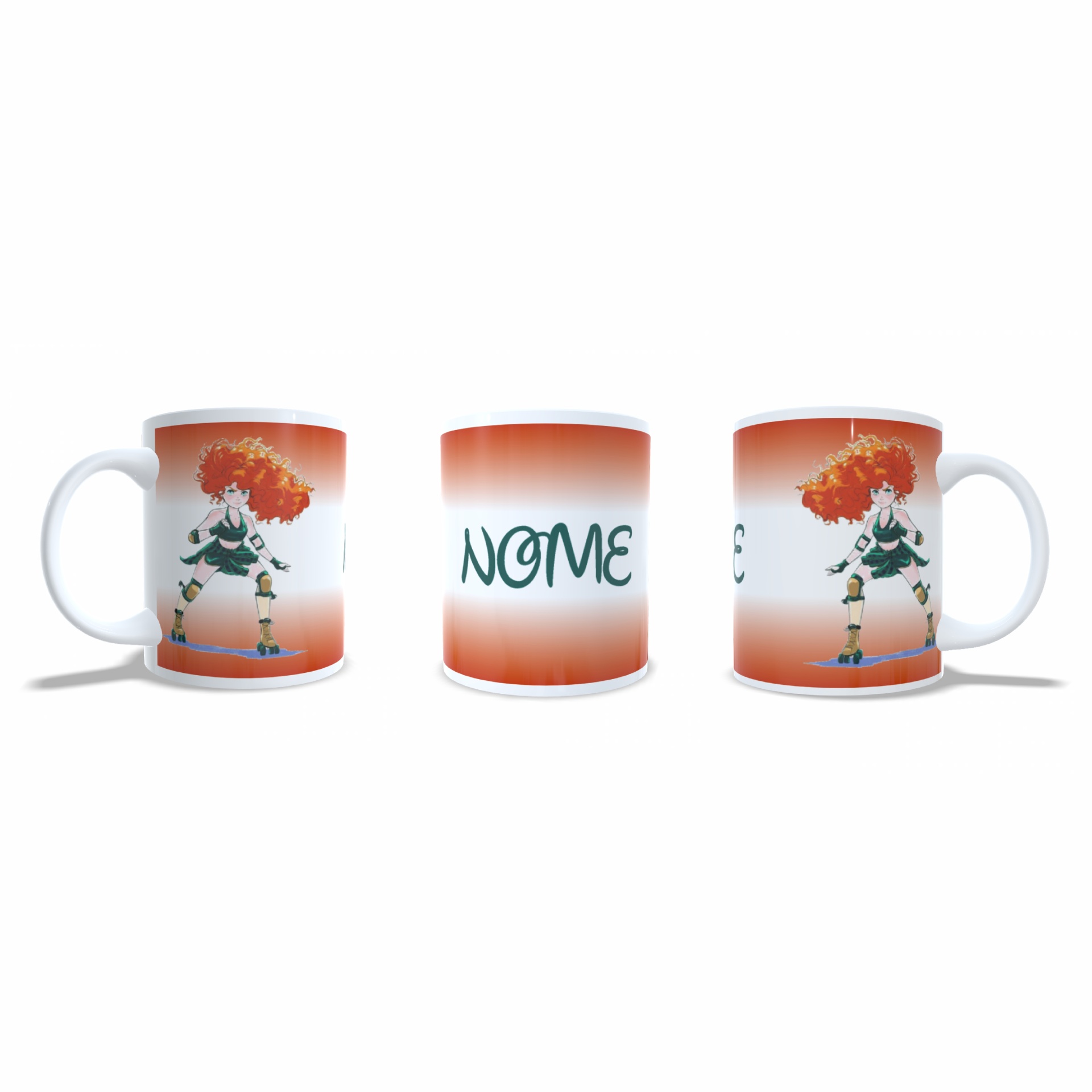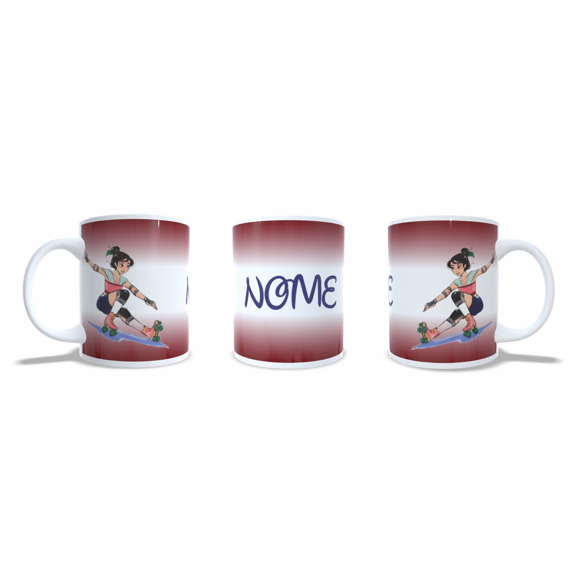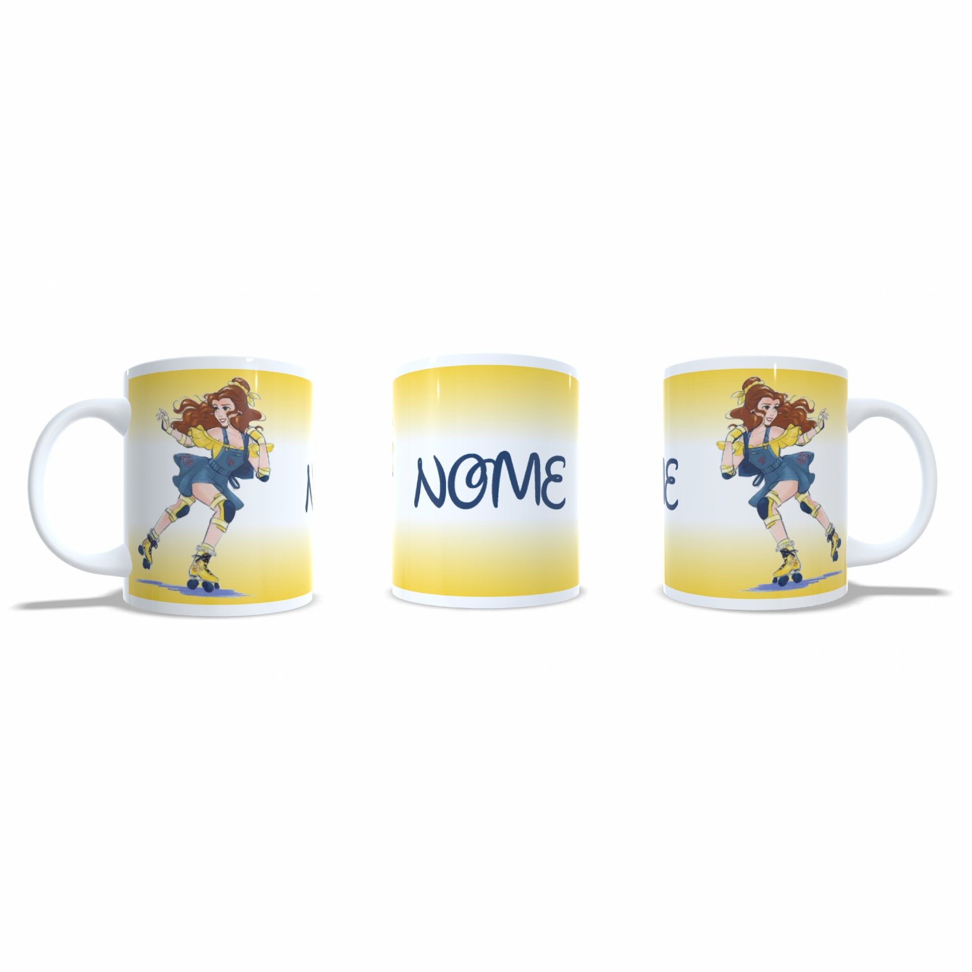 Caneca branca com fundo amarelo, mulher a patinar e a palavra NOME
