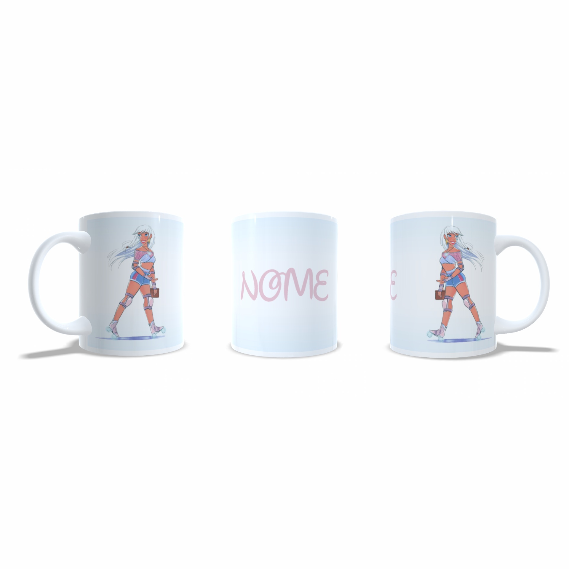 Caneca branca com design de mulher a andar de skate e texto 'NOME'