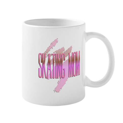 Caneca branca com texto rosa 'SKATING MOM' e padrão em tons de rosa