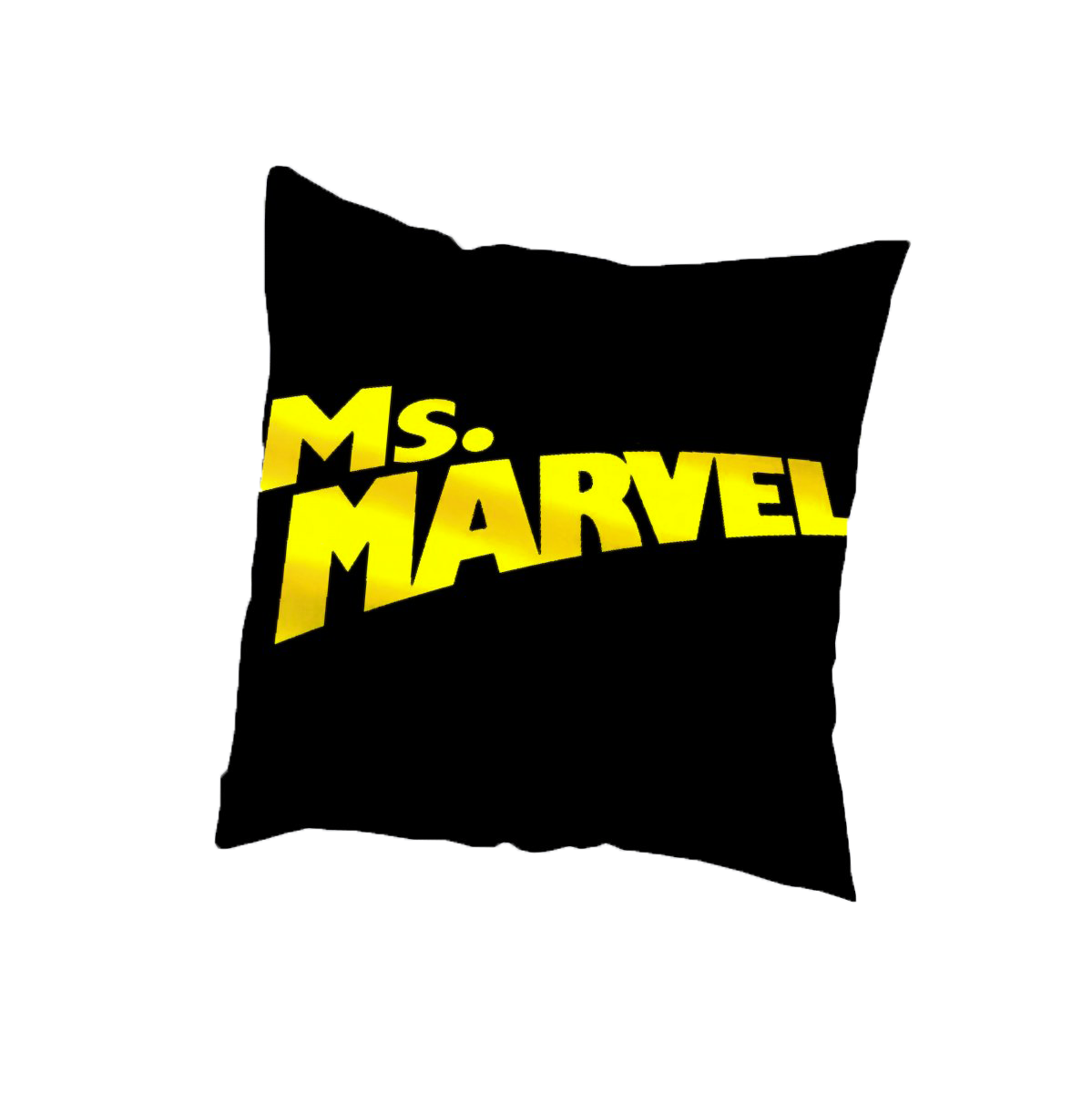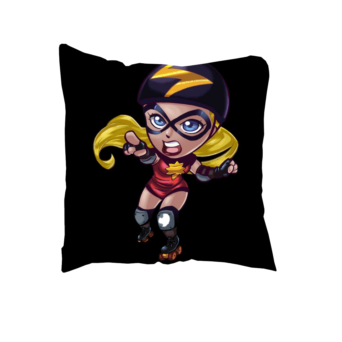 Almofada preta com estampa de personagem animada feminina com capacete e patins.