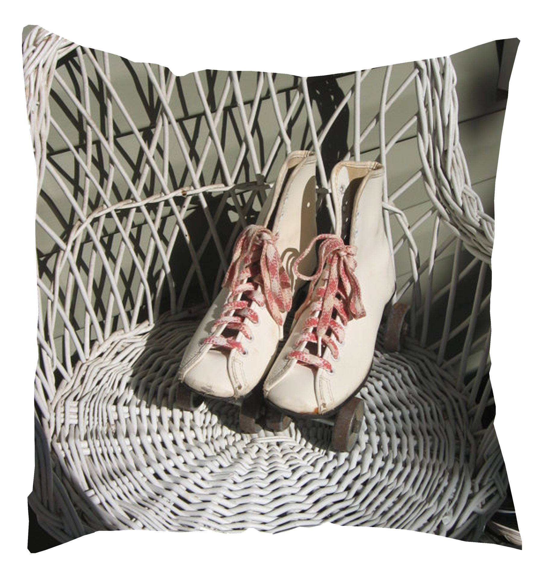 Patins artísticos brancos com atacadores vermelhos numa cadeira de vime branca