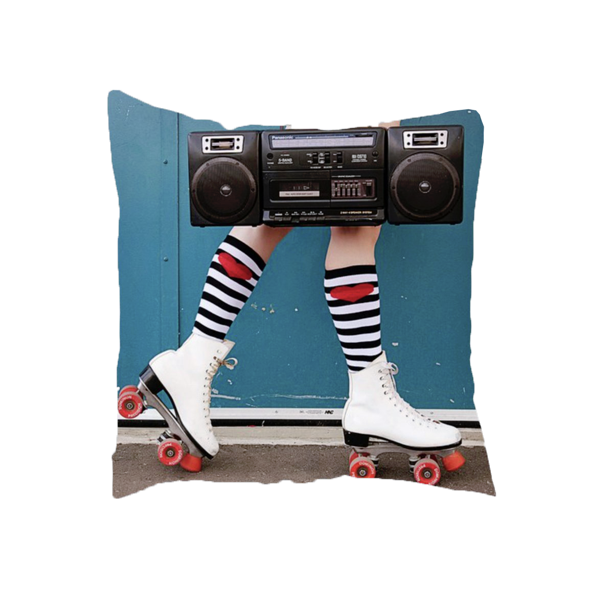 Pessoa com patins brancos e meias às riscas a segurar rádio gravador preto