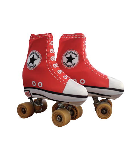 Par de patins clássicos vermelhos com biqueira branca e roda amarela