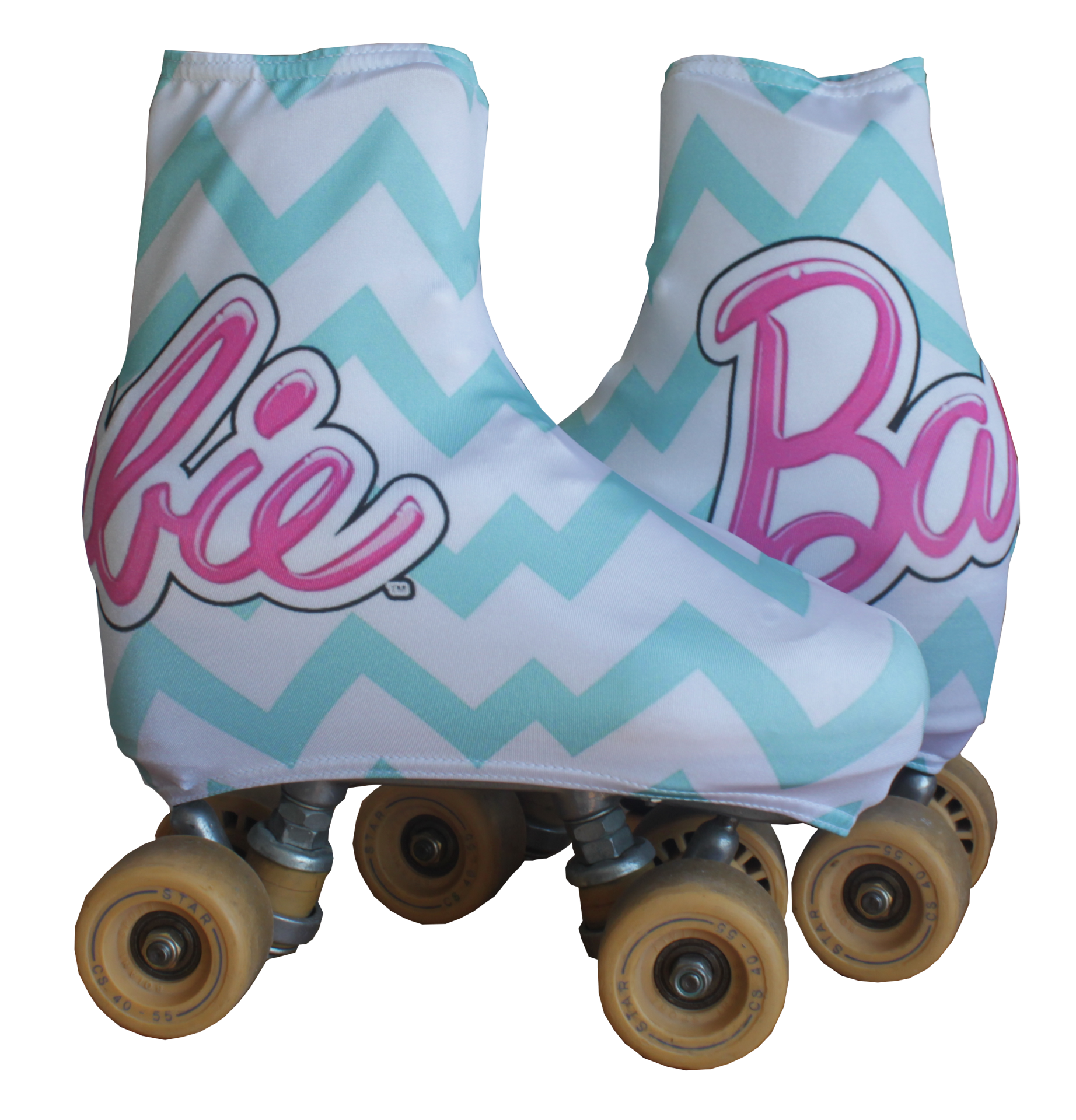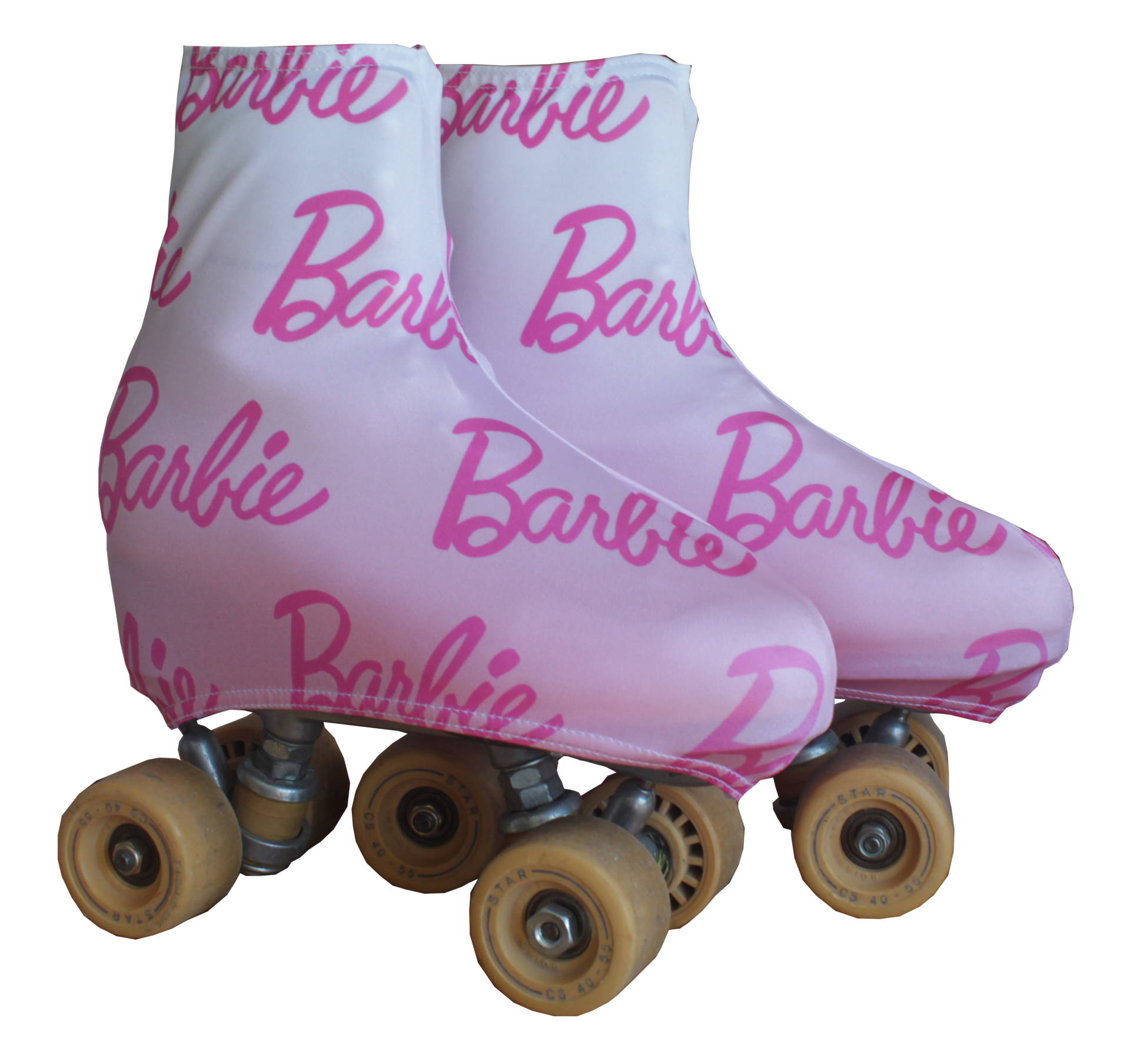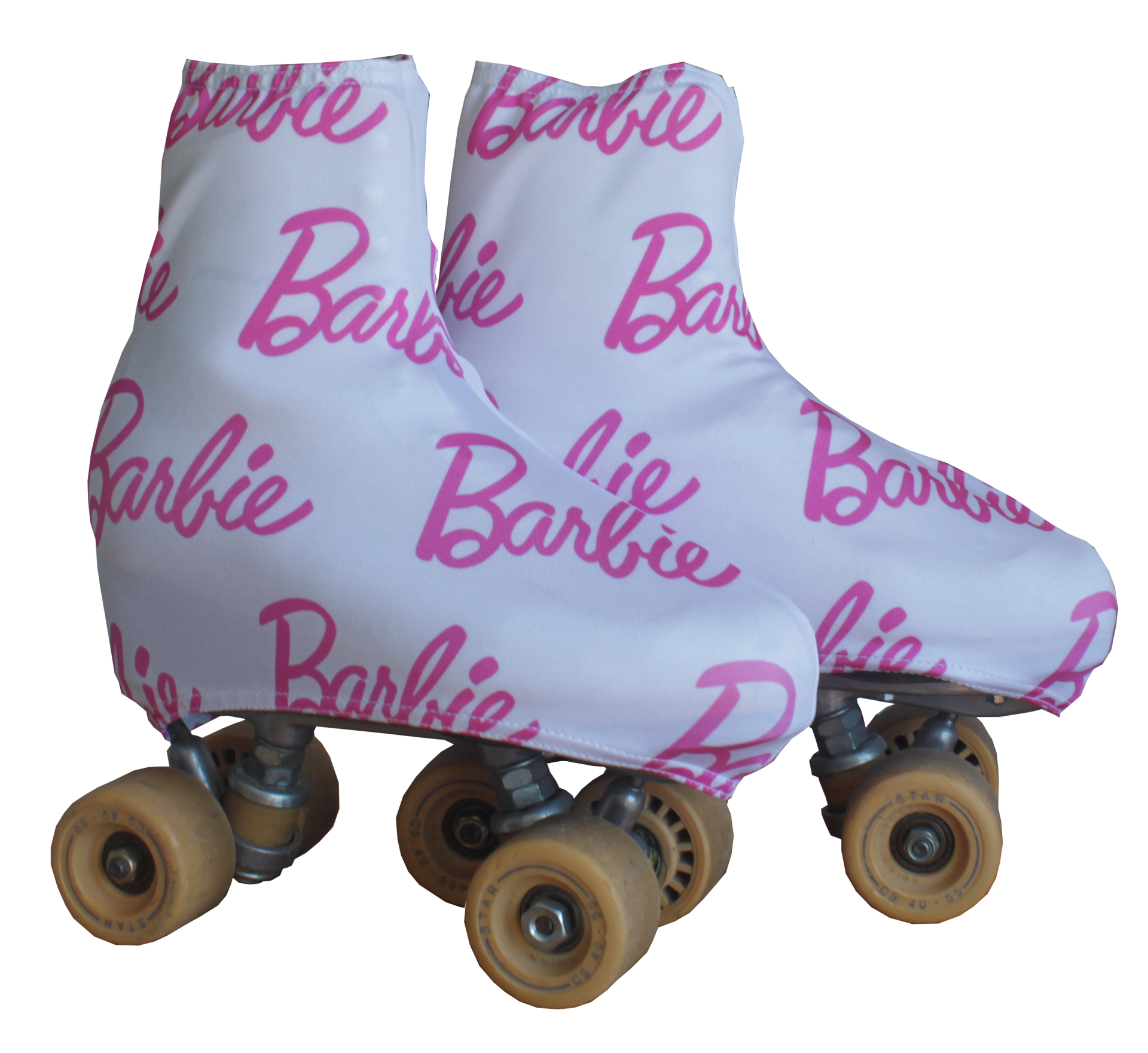 Par de patins quad com capas brancas e texto Barbie em rosa