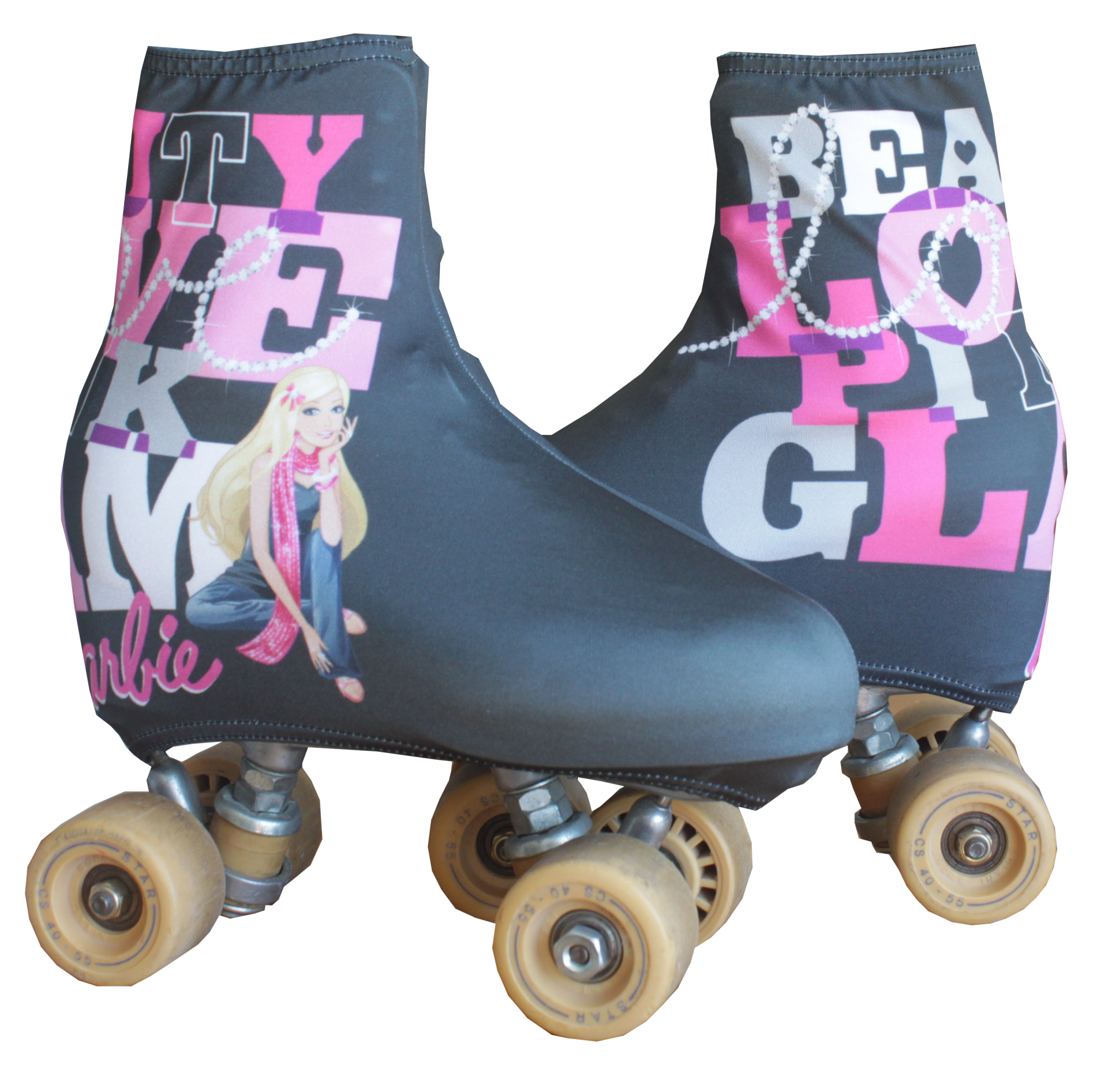 Patins quatro rodas com capa preta decorada com uma boneca loira e textos rosa e branco.