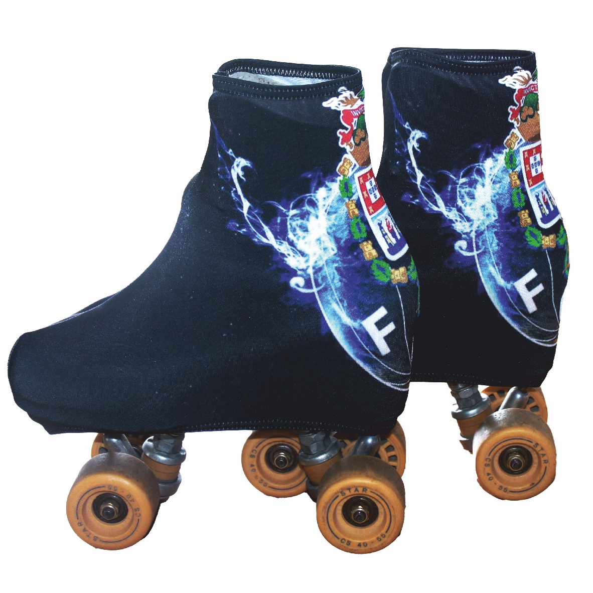 patins clássicos com capa preta e brasão colorido