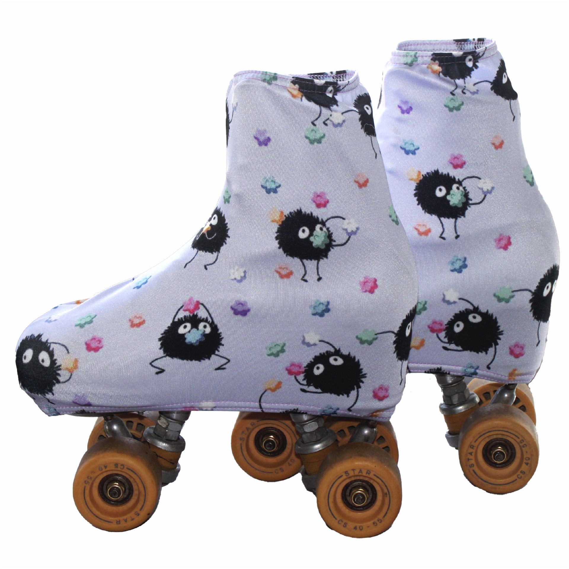 Patins de quatro rodas com capa cinzenta com desenhos de personagens pretos e flores coloridas