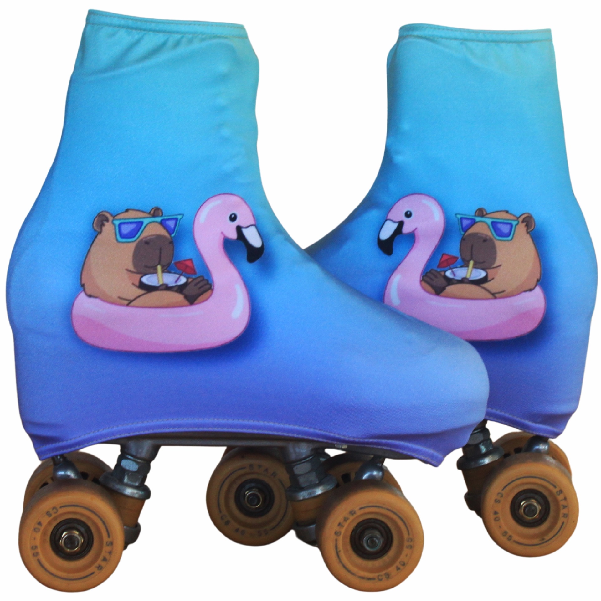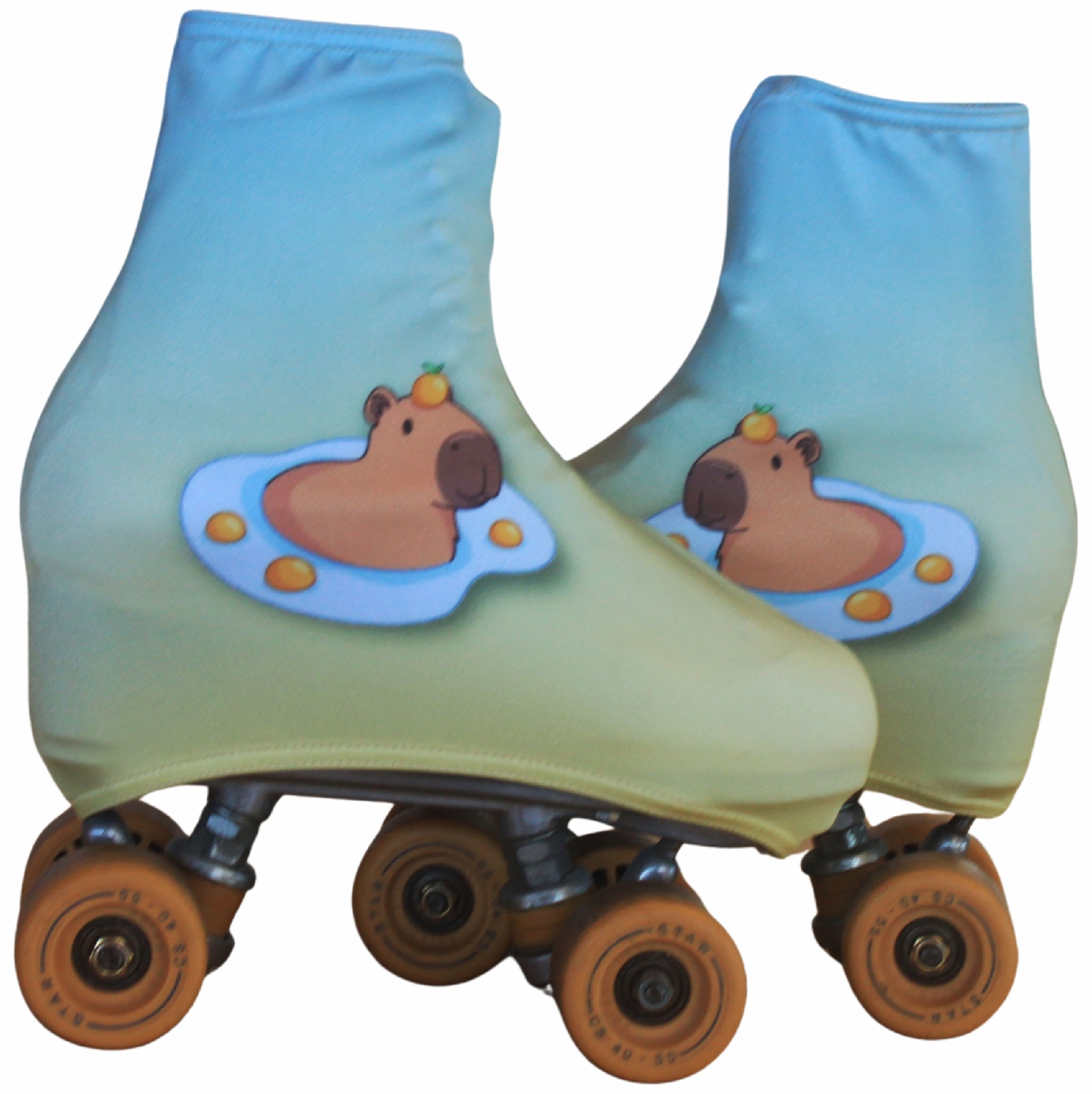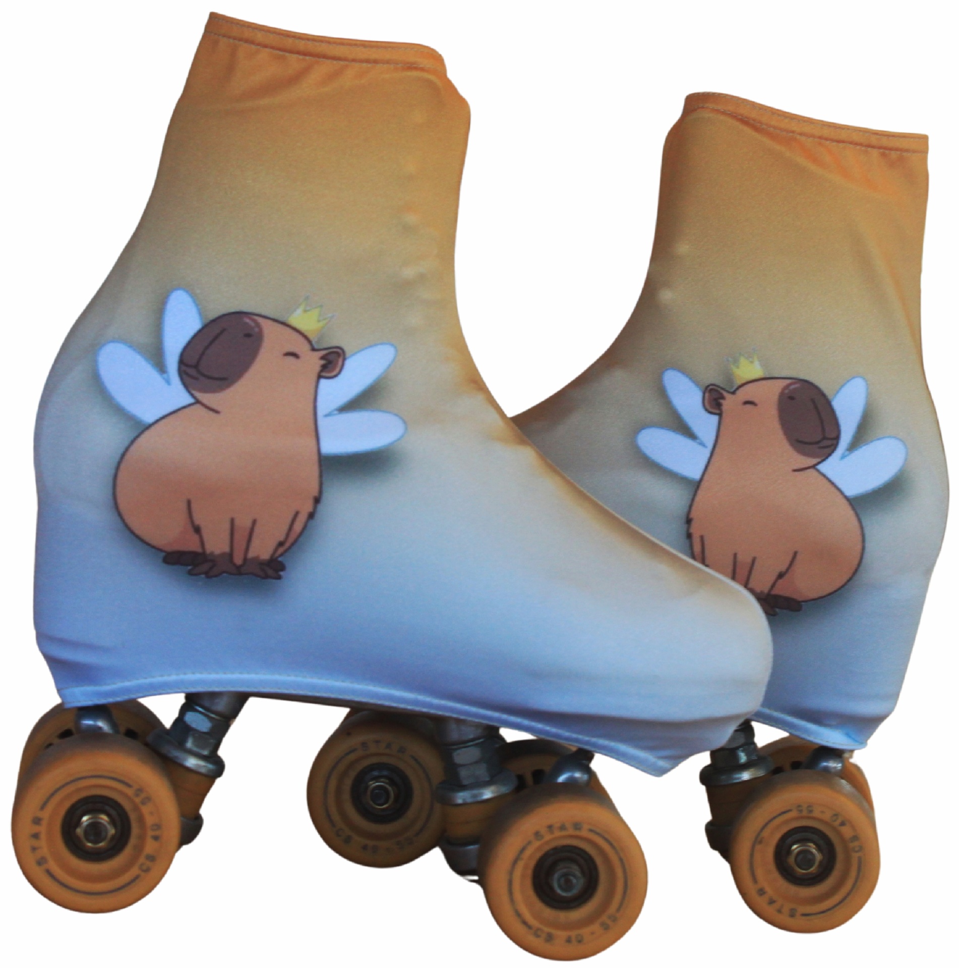 Par de protetores para patins com capivara em fundo degradê amarelo para vermelho