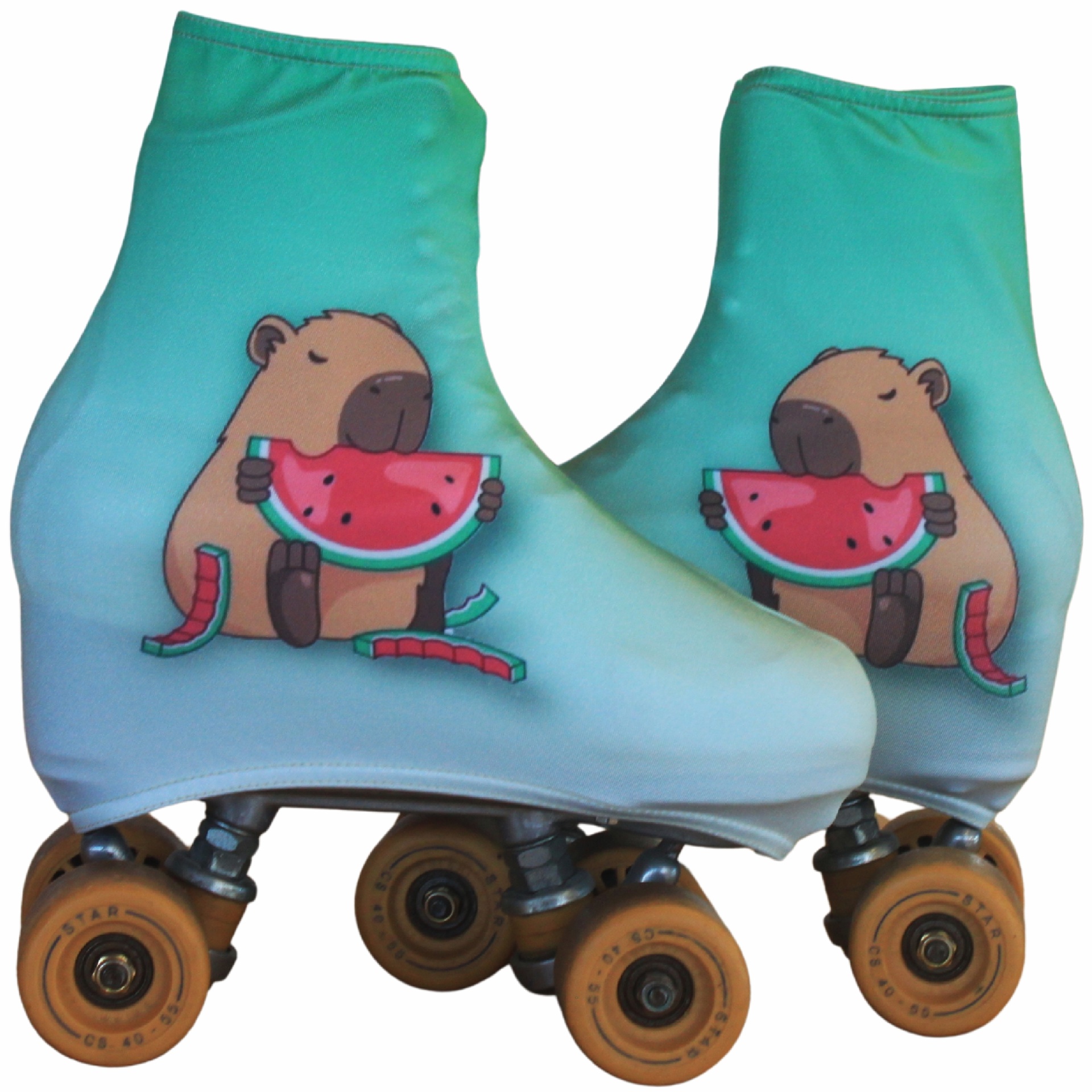 Patins de rodas com capa protetora azul turquesa com urso a comer melancia