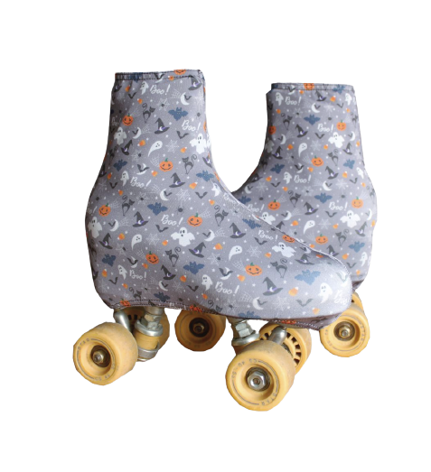 Botas de patinagem com protetores cinza padrão Halloween e rodas amarelas