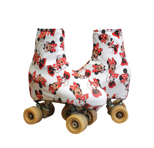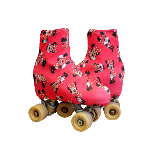 Patins em linha com capa vermelha e padrões da Minnie Mouse