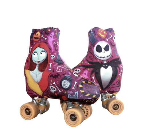 Patins de rodas com capa textil roxa e desenhos de Halloween