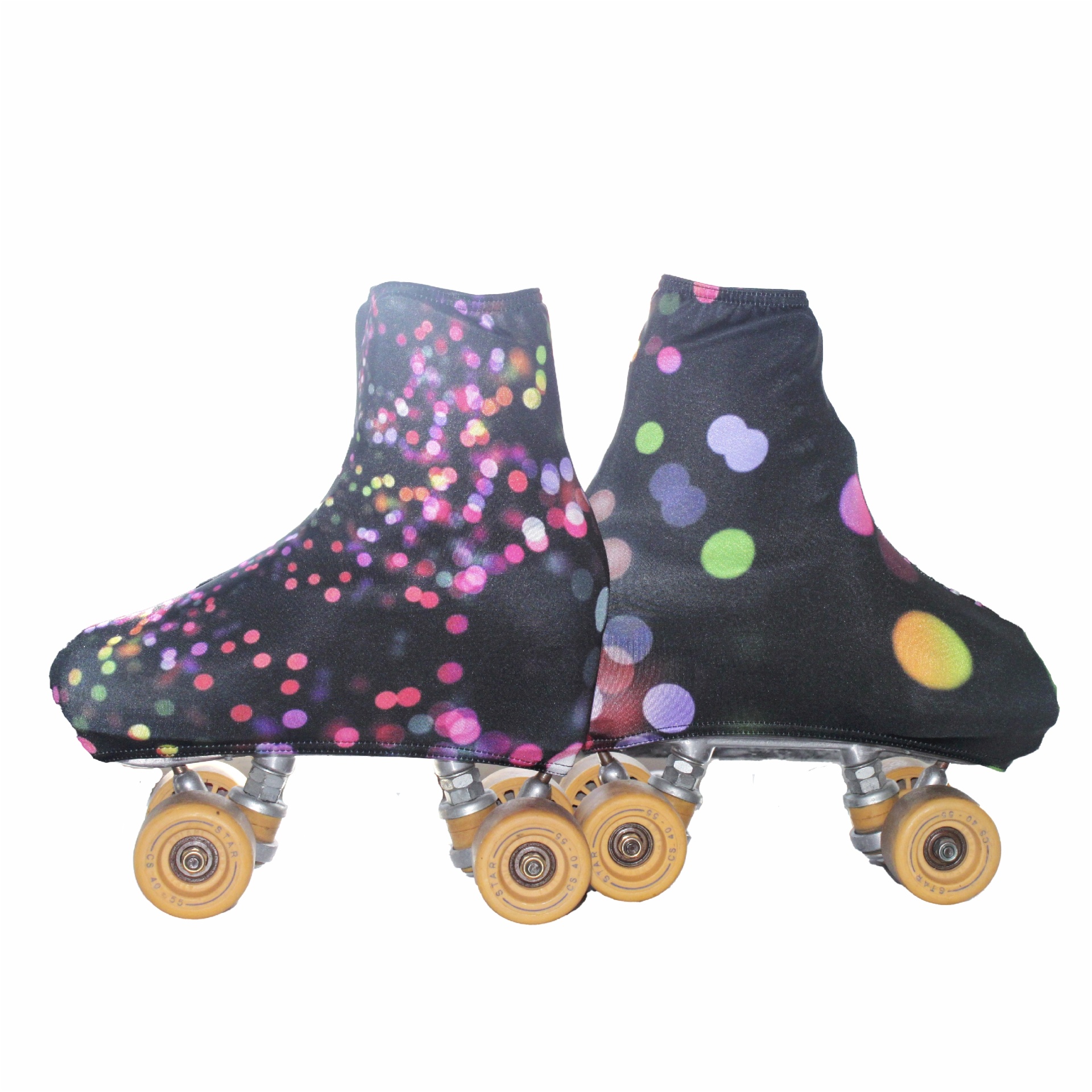 Par de patins com capa preta e bolinhas coloridas