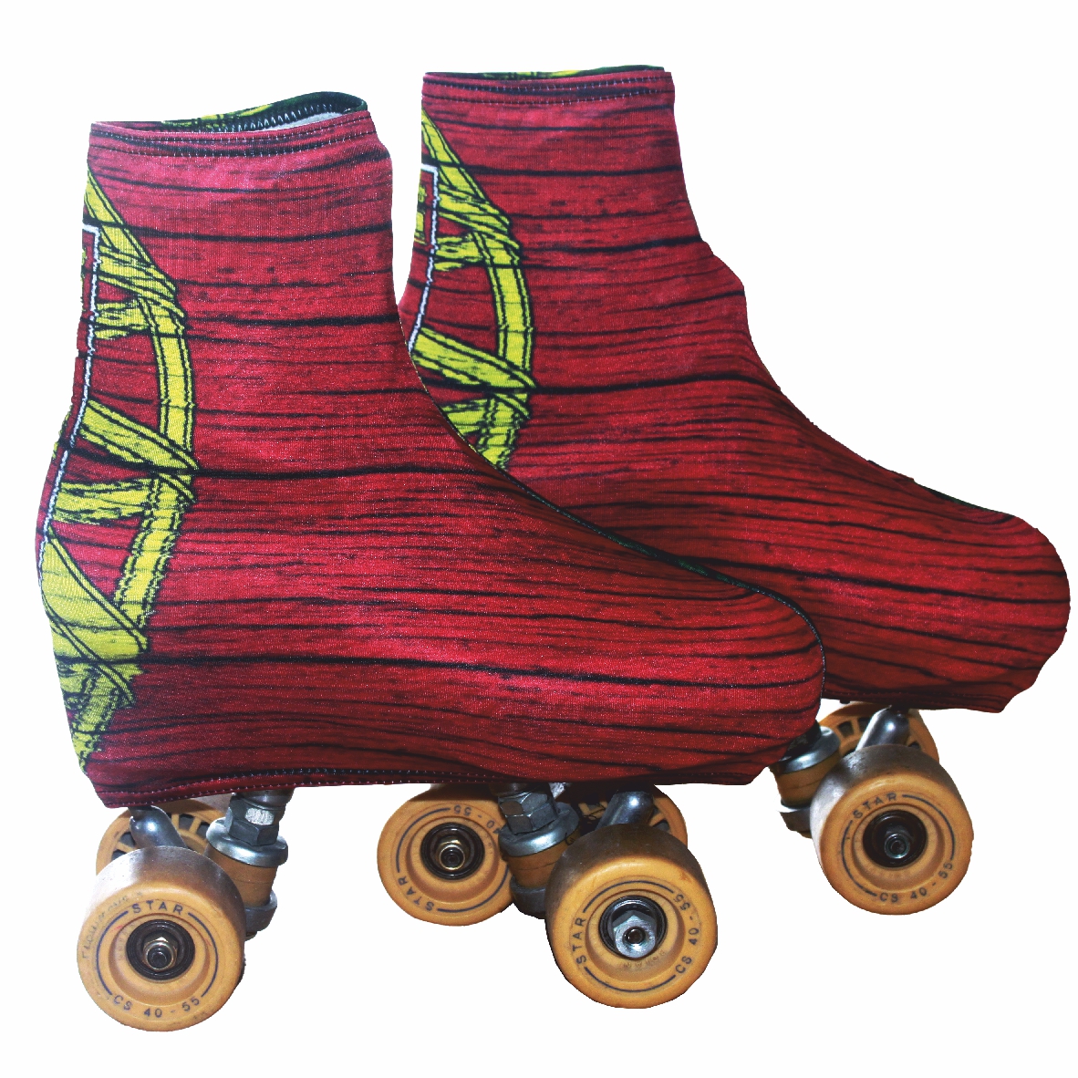 Par de patins com rodas castanhas e tecido colorido com padrão e escudo