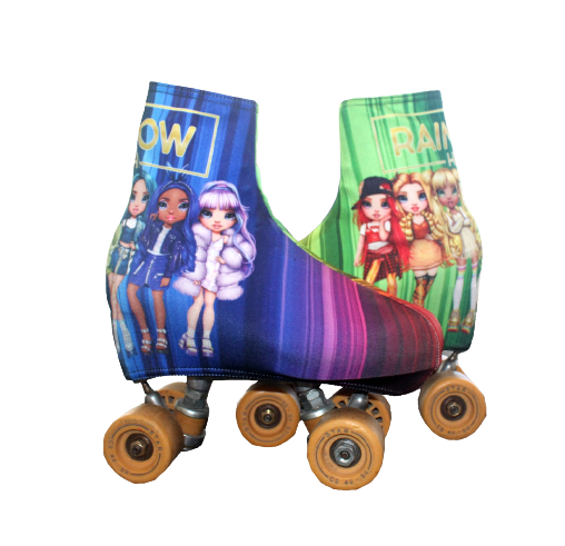 Par de patins de rodas coloridos com desenhos de personagens femininas