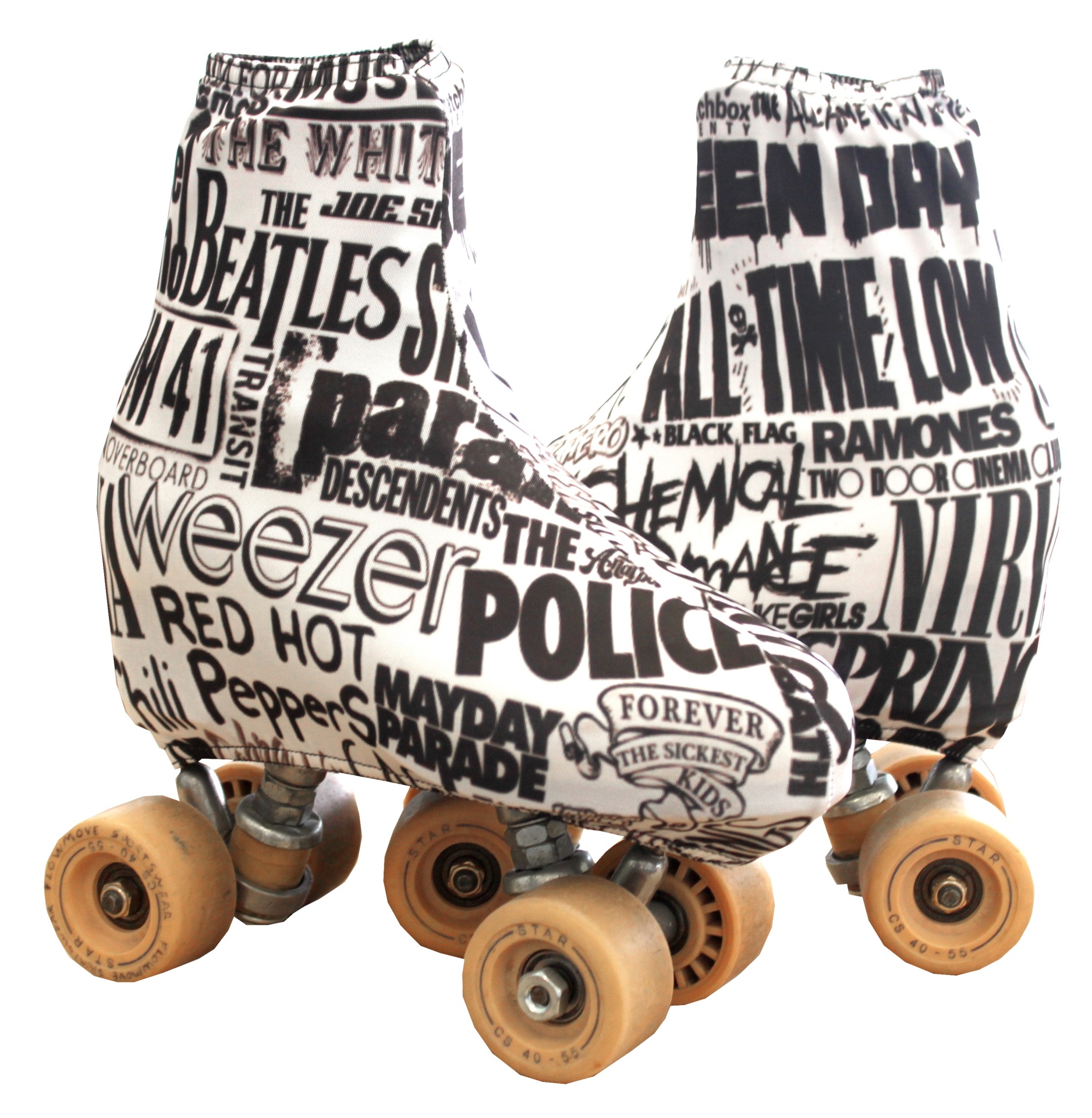 Patins de rodas duplas brancos com estampado preto com nomes de bandas musicais