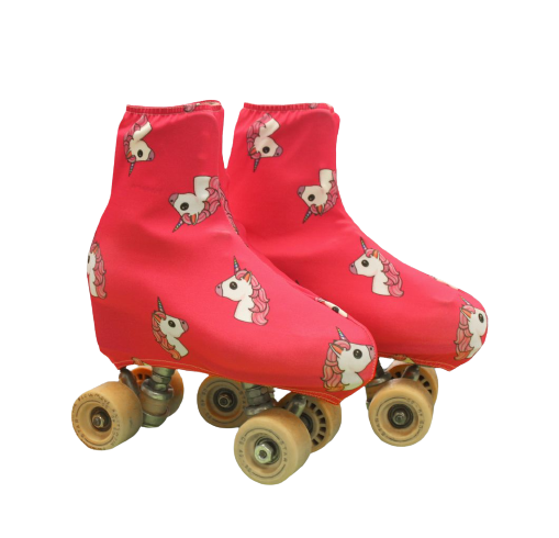 Patins clássicos com capa vermelha e padrão de unicórnios
