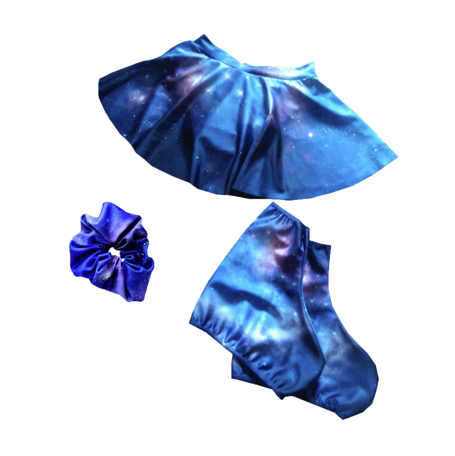 Conjunto azul com padrão de galáxia incluindo saia, meias e scrunchie