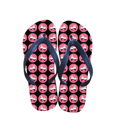 Chinelos de dedo azuis com padrão de patins em círculos rosa no fundo preto