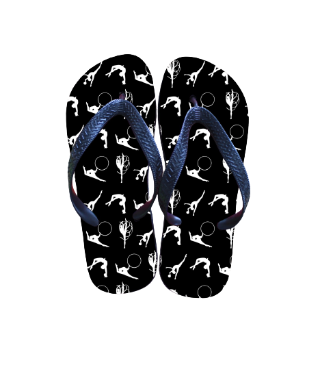 Chinelos de dedo pretos com estampas brancas e tiras azul escuras