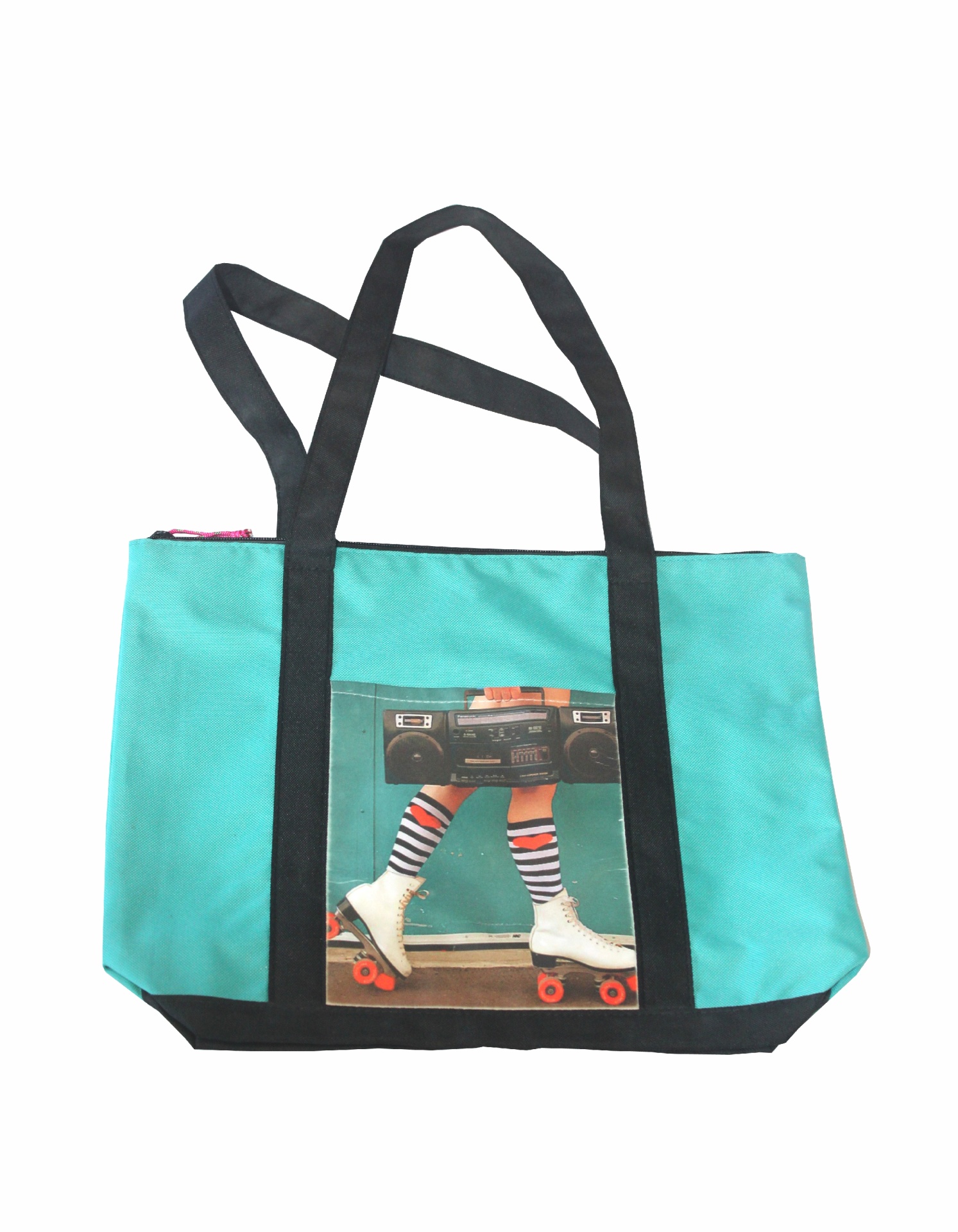 Saco turquesa com alças pretas e imagem de pernas com patins e rádio