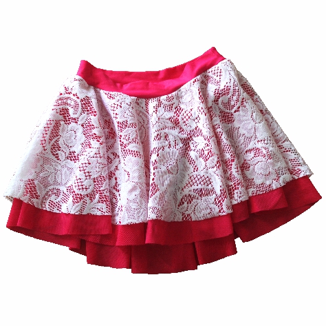 Saia feminina branca com renda sobre vermelho e cós vermelho