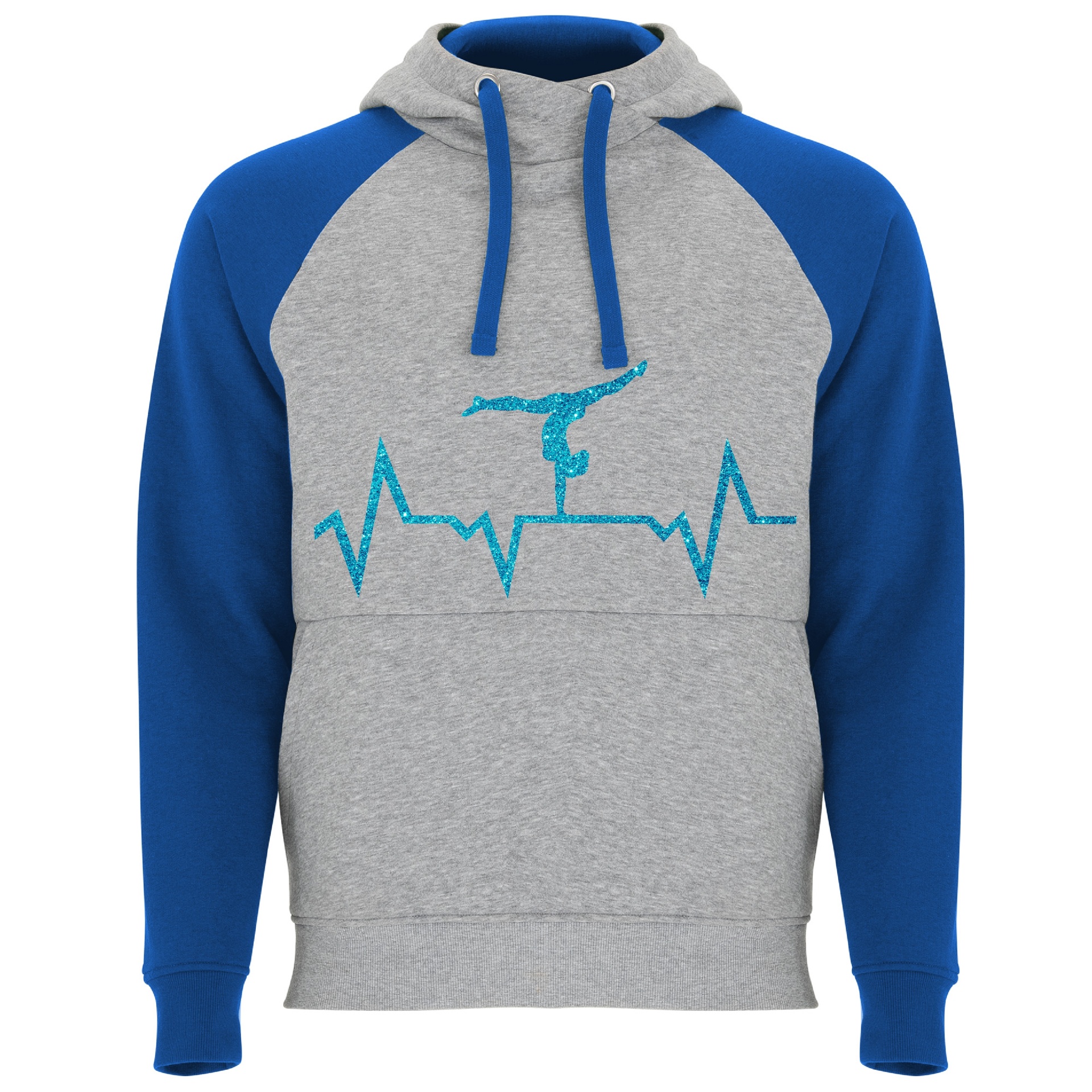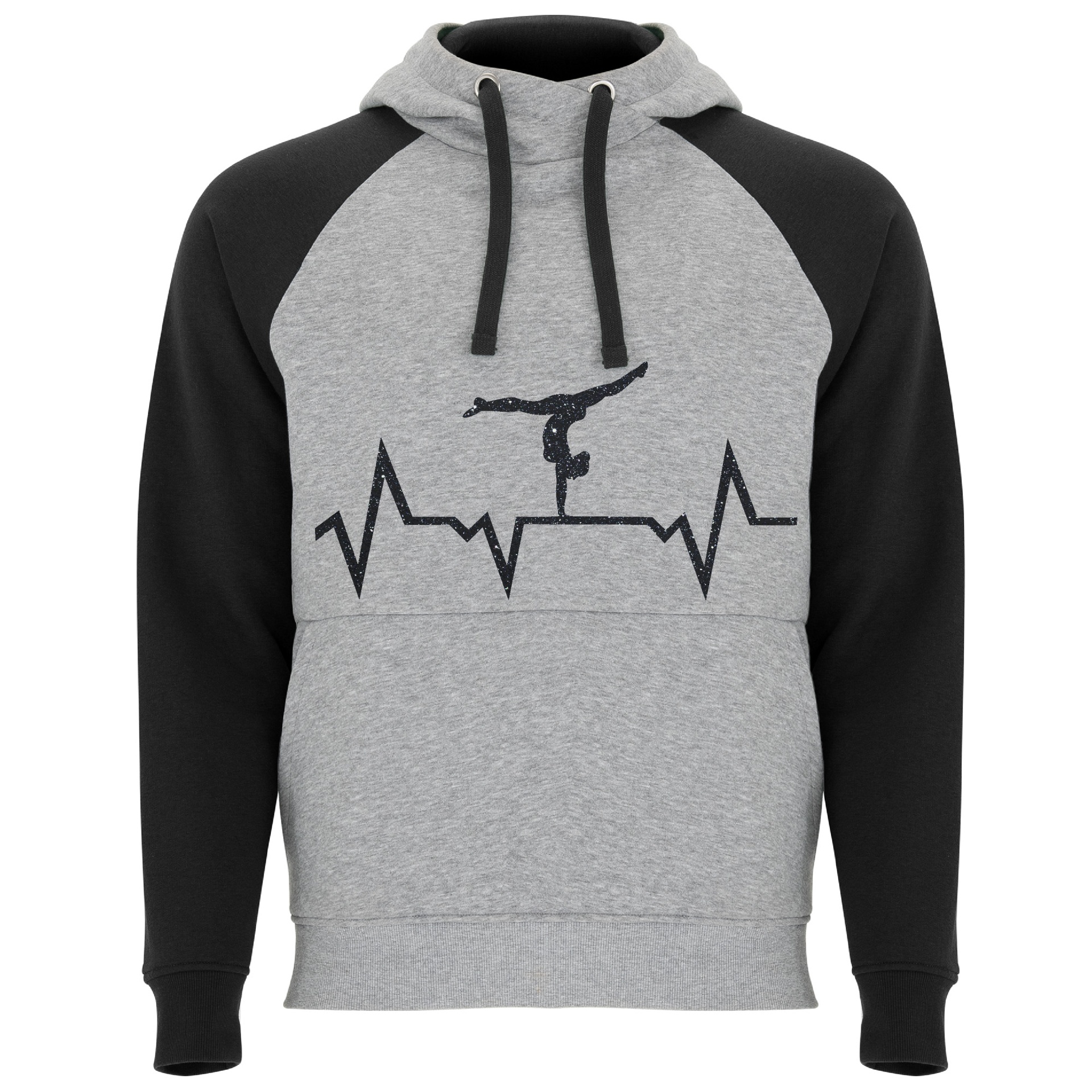 Camisola com capuz cinzenta com mangas pretas e gráfico de batimento cardíaco e ginasta no peito