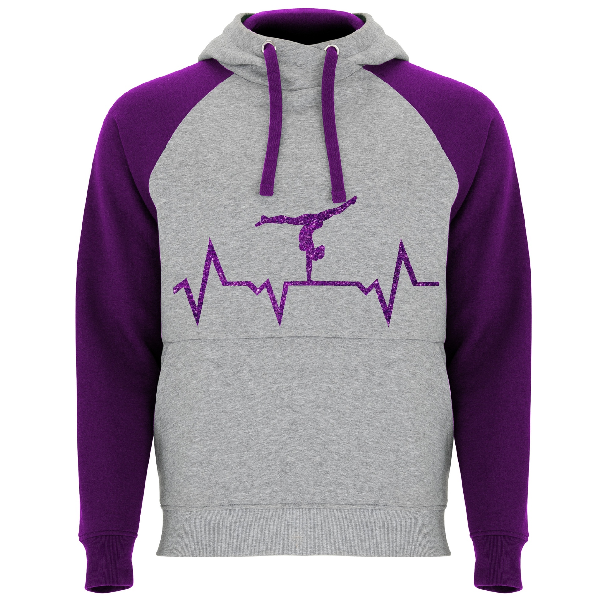 Sweatshirt de capuz cinzenta e roxa com estampa de batimento cardíaco e ginasta