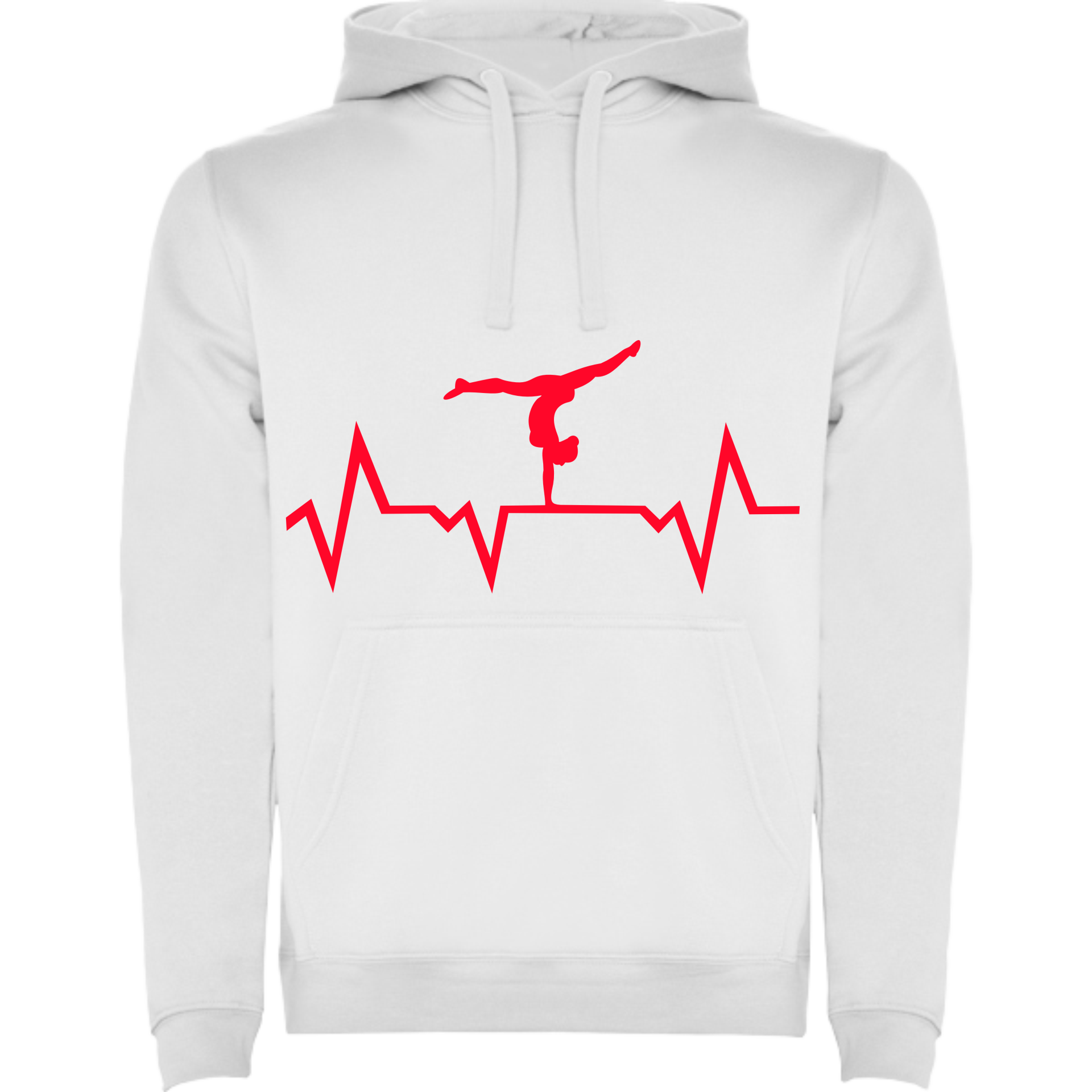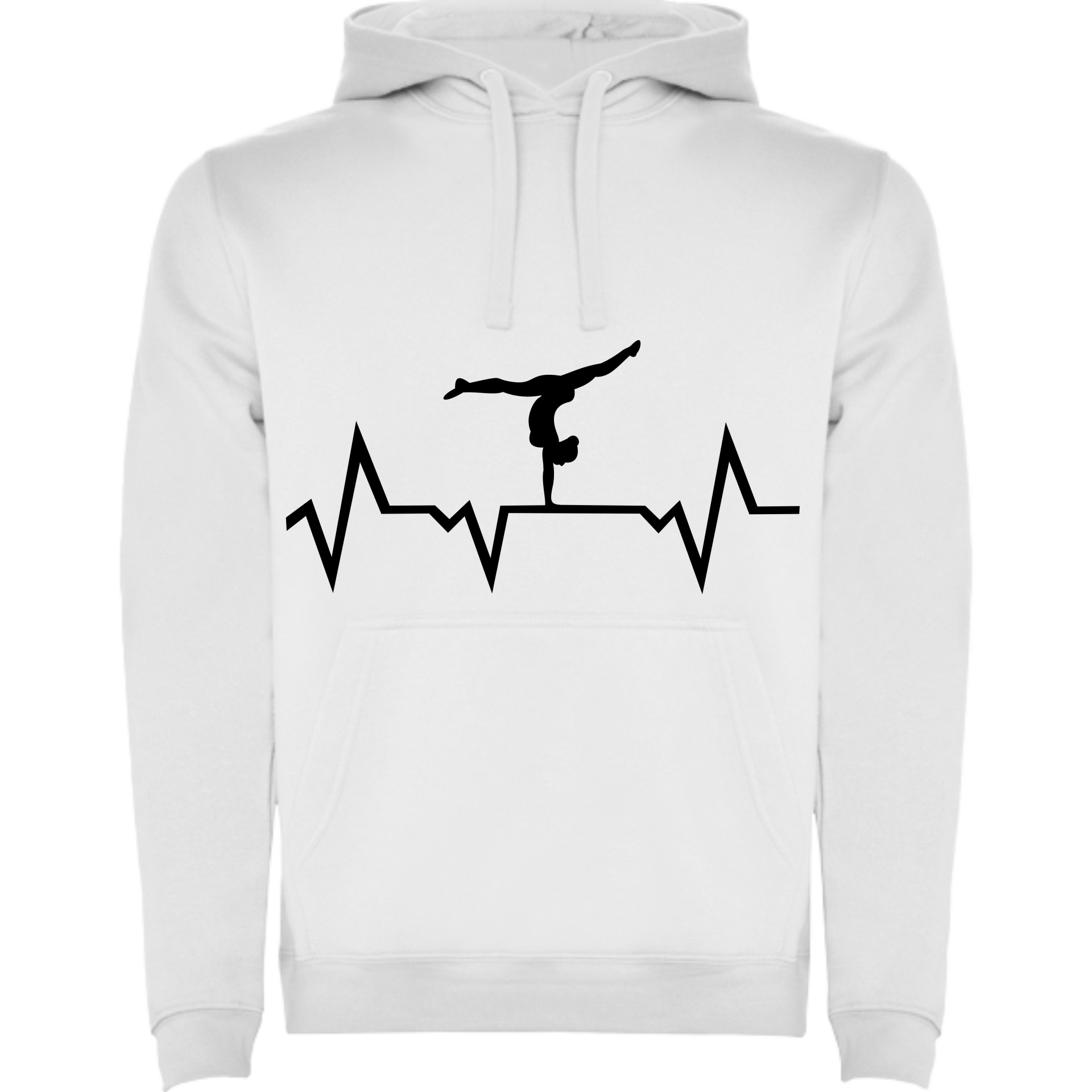sweatshirt branca com estampa preta de linha cardíaca e figura humana a fazer handstand
