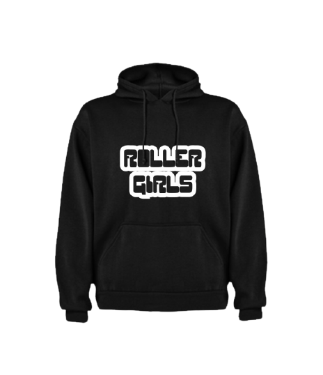 Sweatshirt preta com capuz e texto branco 'ROLLER GIRLS'