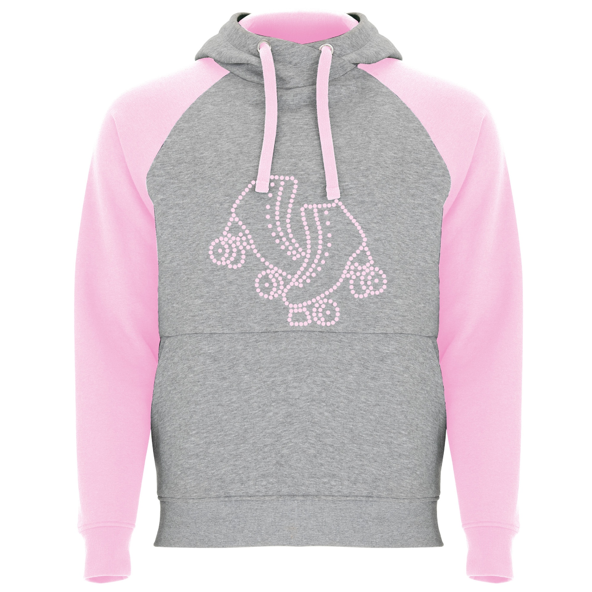 Sweatshirt cinza e rosa com desenho de patins de rodinhas e capuz