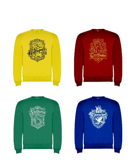 Quatro sweatshirts coloridas com brasões e nomes dos grupos de Hogwarts