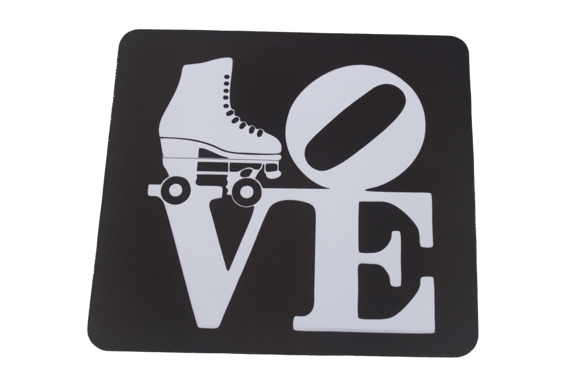 Placa preta com palavra 'LOVE' branca e patim de rodas a substituir a letra O