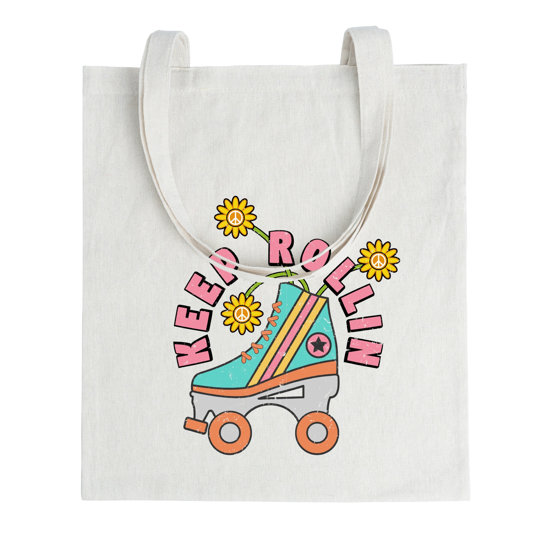Saco de tecido branco com estampa de patim azul e flores amarelas com texto KEEP ROLLIN