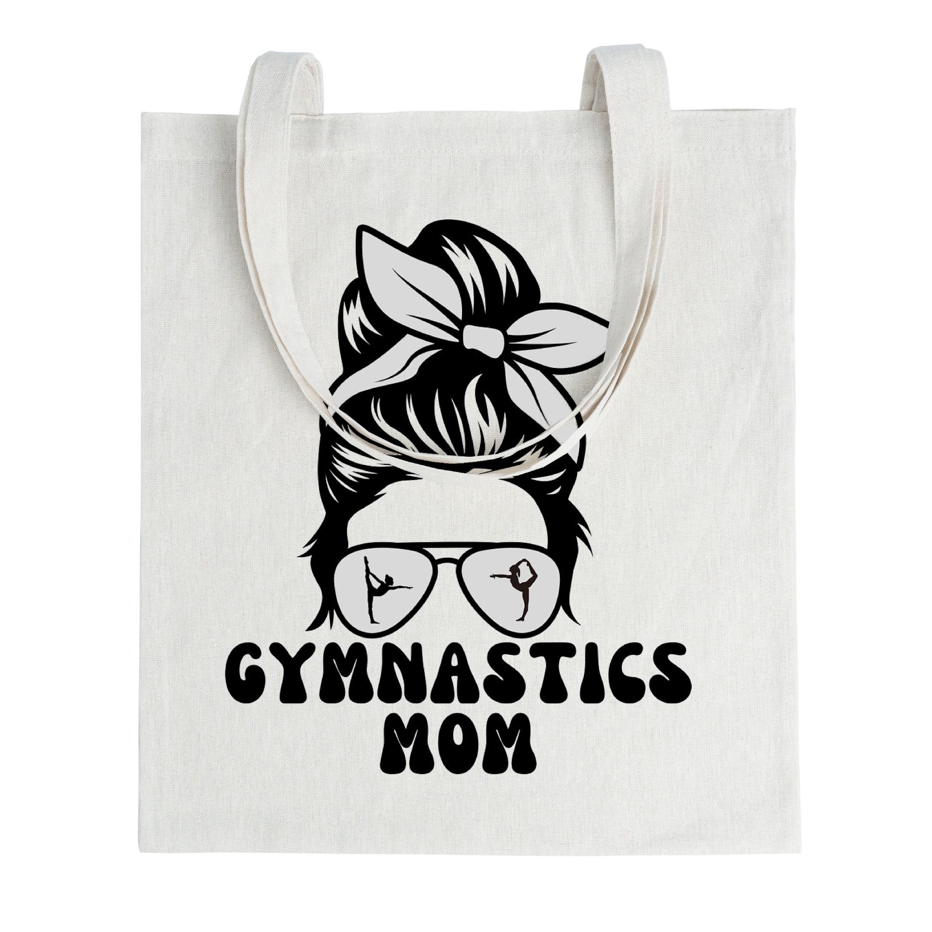 Saco de tecido branco com estampa preta de cabeça com lenço e óculos, texto GYMNASTICS MOM