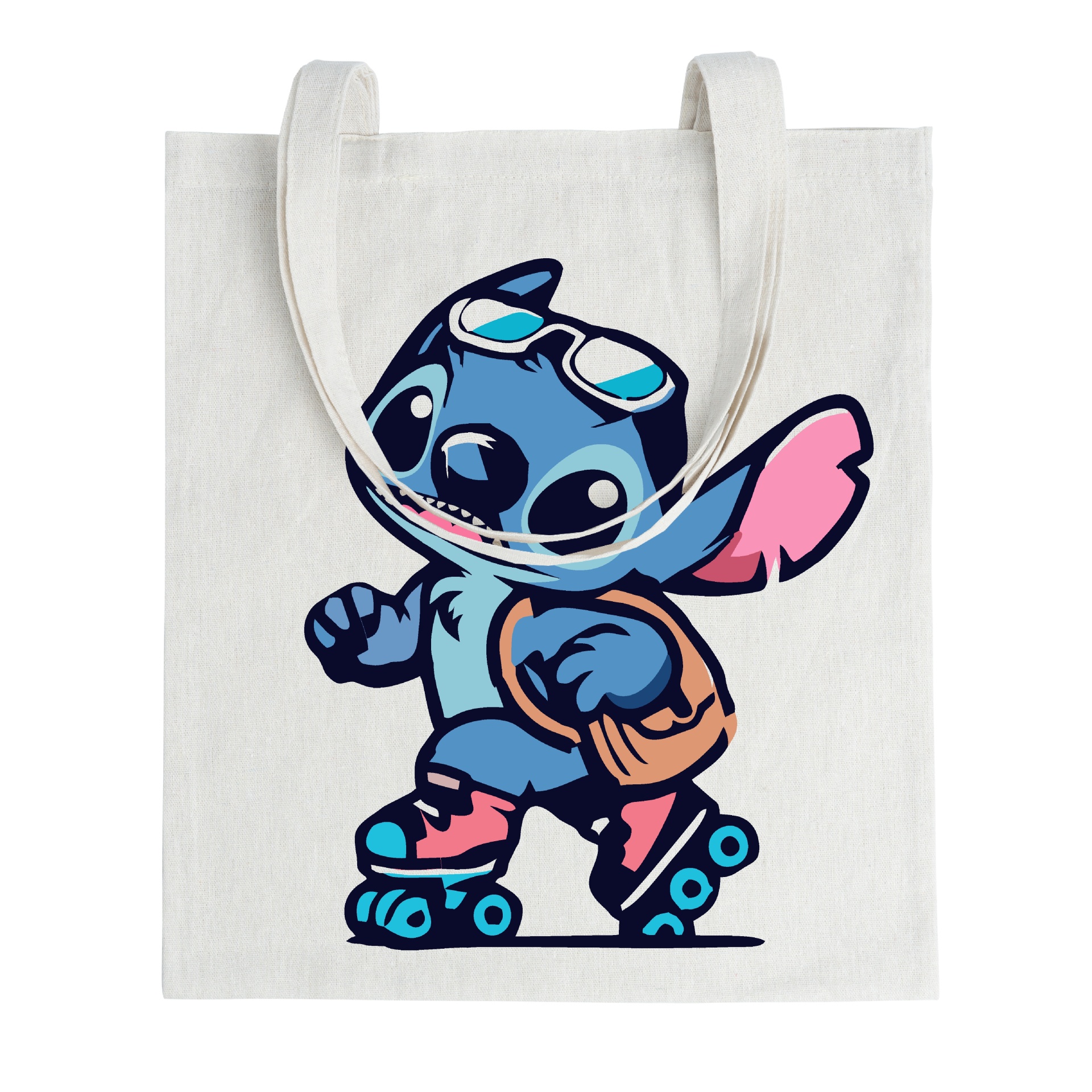 Saco de tecido branco com estampa de personagem azul em patins e óculos de sol