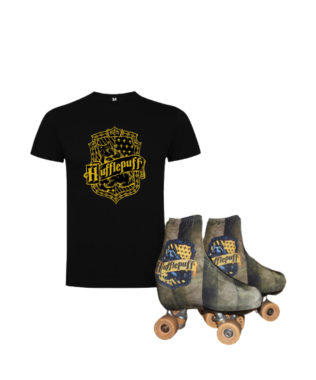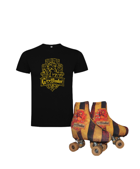 T-shirt preta com brasão Gryffindor amarelo e patins de rodas às riscas castanho e amarelo com logotipo Gryffindor vermelho.