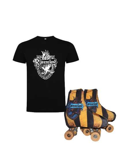 T-shirt preta com logotipo Ravenclaw e patins em linha laranja e pretos com logotipo Ravenclaw